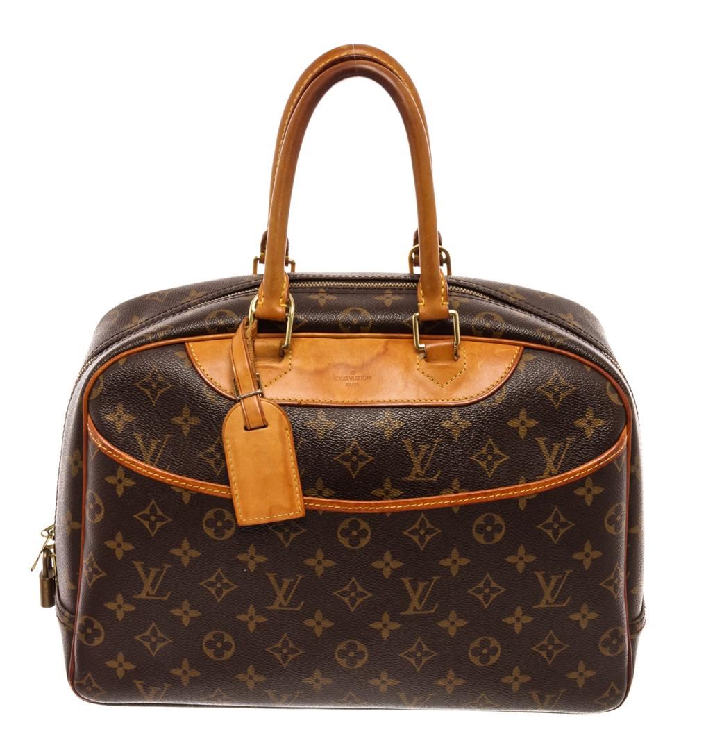 Louis Vuitton Brown Monogram Canvas Deauville Satchel Bag. All available information is listed in the description and shown in the photos. Louis Vuitton Brown Monogram Canvas Deauville Satchel Bag with gold-tone hardware, monogram canvas, leather tag, debossed logo, two-way zip fastening, two rounded top handles, front patch pocket, internal patch pockets, internal logo patch. Depth 5.9 in, Handle 4.3 in, Height 11.4 in, Width 13.8 in / Depth 15 cm, Handle 11 cm, Height 29 cm, Width 35 cm