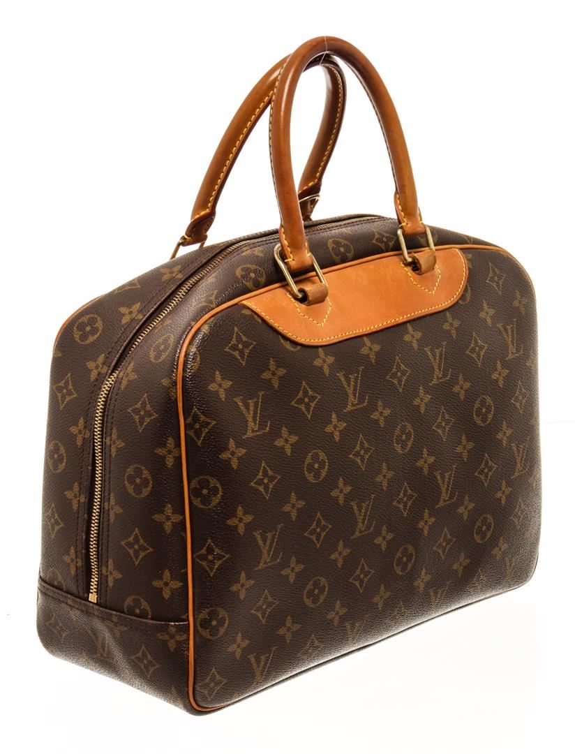 One Louis Vuitton Brown Monogram Canvas Deauville Satchel Bag. Item is sold AS-IS. All available information is listed in the description and shown in the photo. monogram deauville handbag from louis vuitton gold-tone hardware, monogram canvas, leather tag, debossed logo, two-way zip fastening, two rounded top handles, front patch pocket, internal patch pockets, internal logo patch. Depth 5.9 in, Handle 4.3 in, Height 11.4 in, Width 13.8 in / Depth 15 cm, Handle 11 cm, Height 29 cm, Width 35 cm