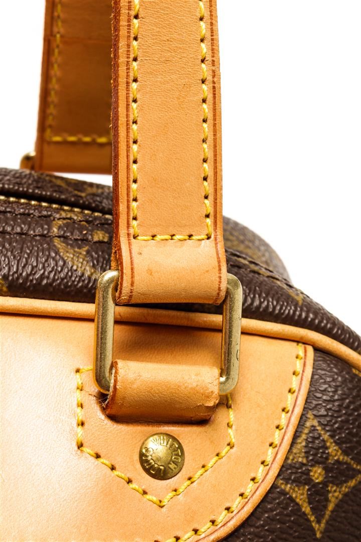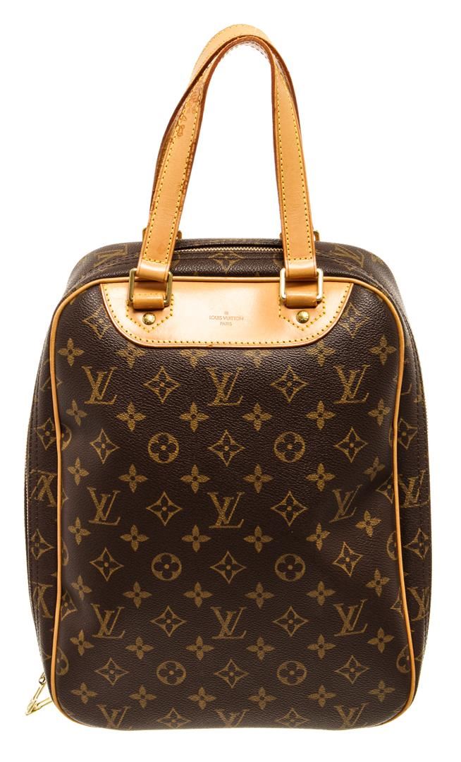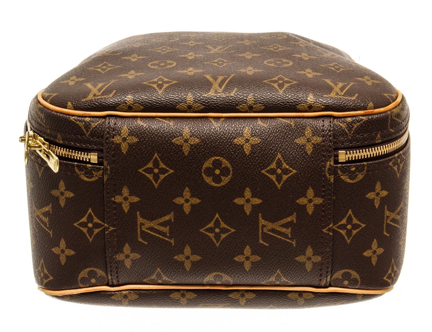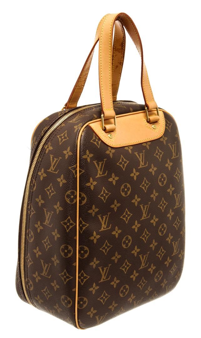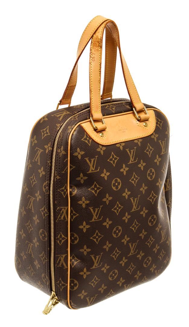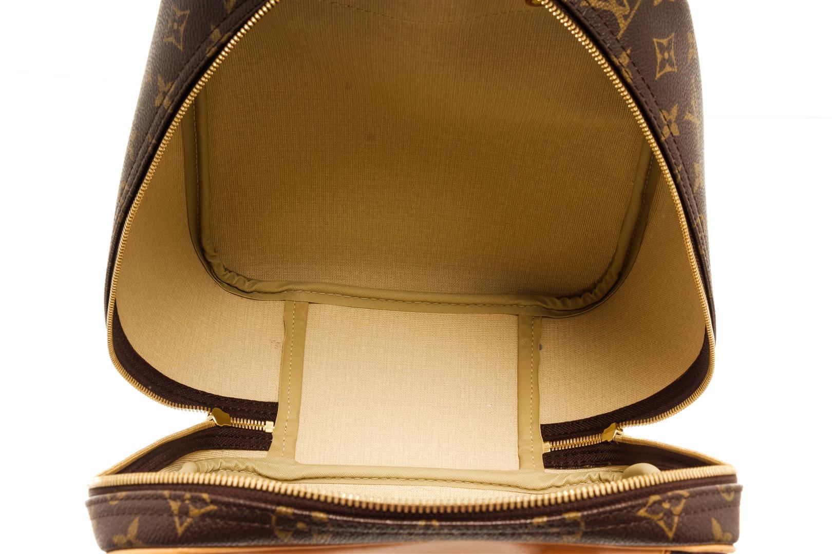 Louis Vuitton Brown Monogram Canvas Excursion Handbag. All available information is listed in the description and shown in the photos. Louis Vuitton Brown Monogram Canvas Excursion Handbag with top vachetta handle, canvas lining, gold tone hardware and zipper closure. 10"W x 13.5"H x 5"D 5" handle drop / 25.4 x 34.2 x 12.7 Cm