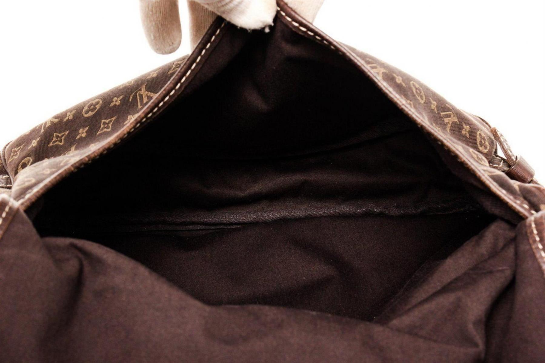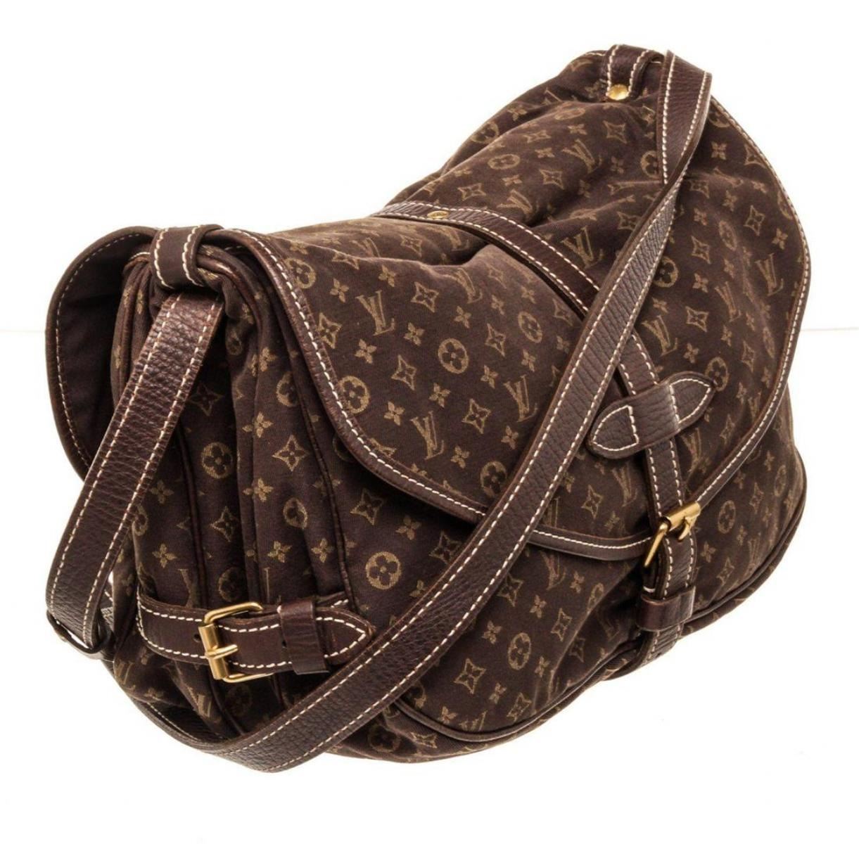 Louis Vuitton Brown Monogram Canvas Idylle Saumur Crossbody Bag with monogram canvas, brass hardware, midnight leather trim, single flat shoulder strap with buckle adjustments, buckle accents at sides, dual compartments, navy canvas lining, single interior wall pocket and dual buckle closures at flaps.