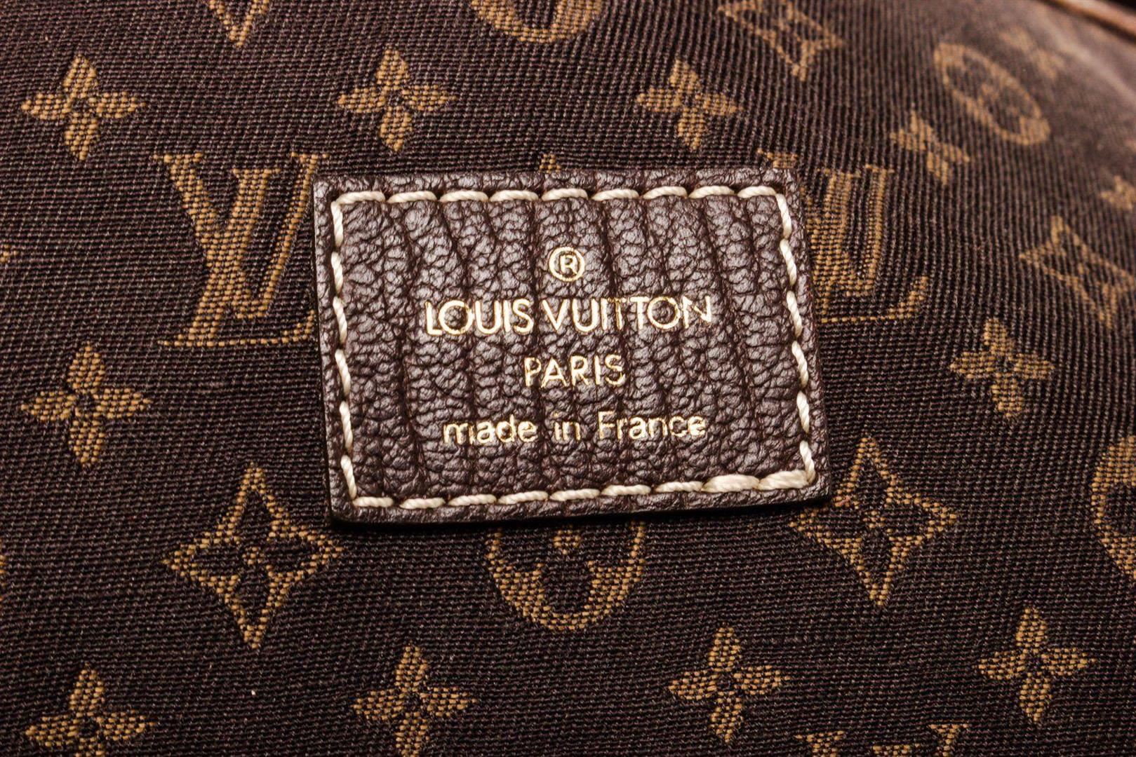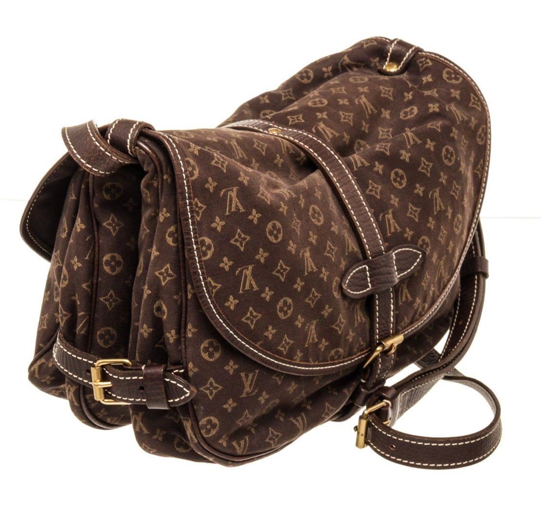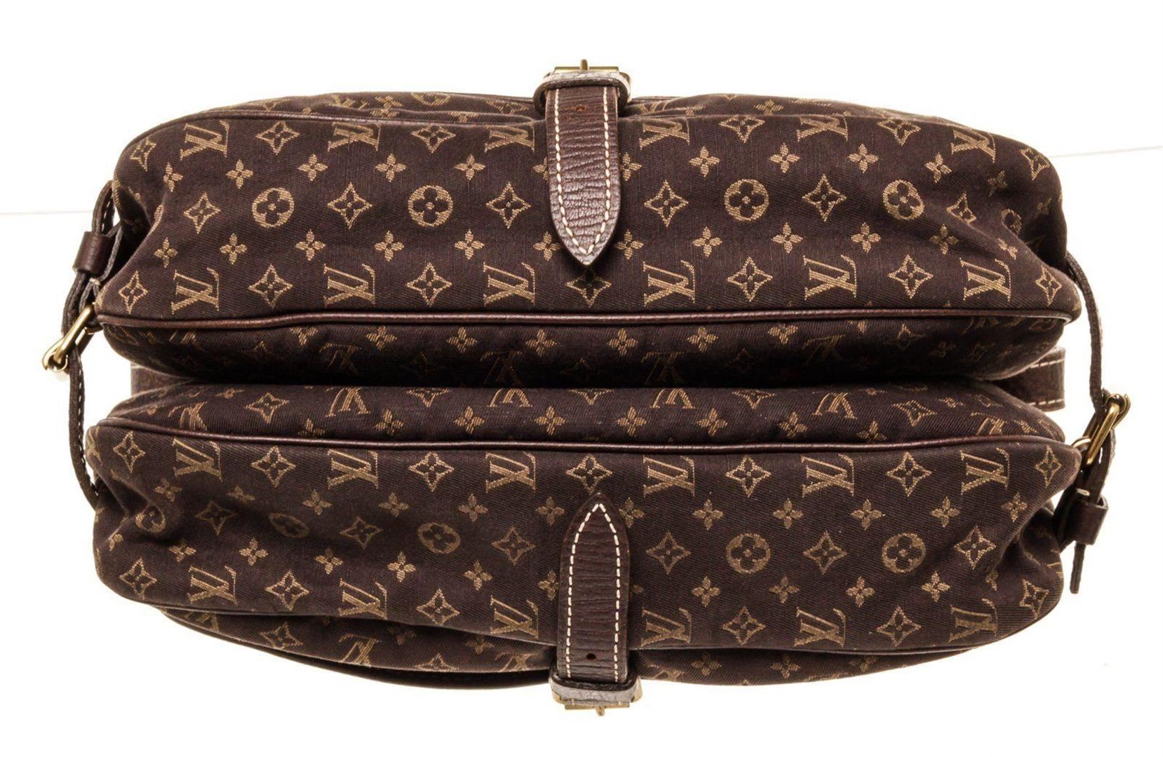 Louis Vuitton Brown Monogram Canvas Idylle Saumur Crossbody Bag with monogram canvas, brass hardware, midnight leather trim, single flat shoulder strap with buckle adjustments, buckle accents at sides, dual compartments, navy canvas lining, single interior wall pocket and dual buckle closures at flaps.