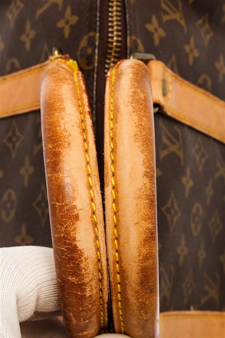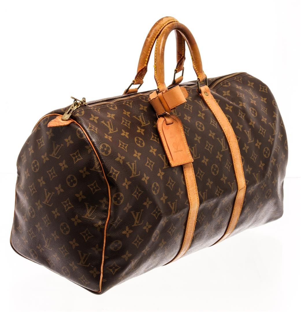 Louis Vuitton Brown Monogram Canvas Keepall 50 Travel Bag. All available information is listed in the description and shown in the photos. Louis Vuitton Brown Monogram Canvas Keepall 50 Travel Bag with gold-tone hardware, trim tan vachetta leather, brown canvas lining, leather trim inside, golden brass, rounded leather handles. Depth 8.3 in, Width 19.7 in/ Depth 21 cm, Width 50 cm