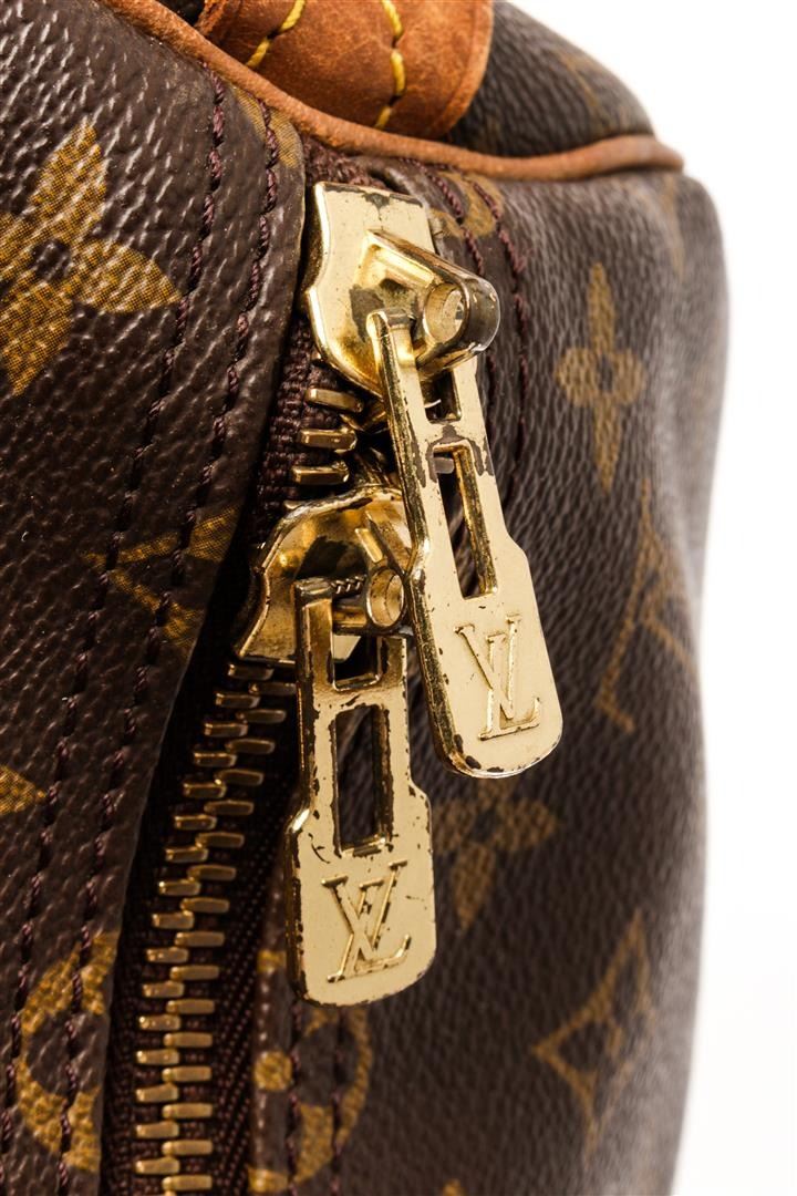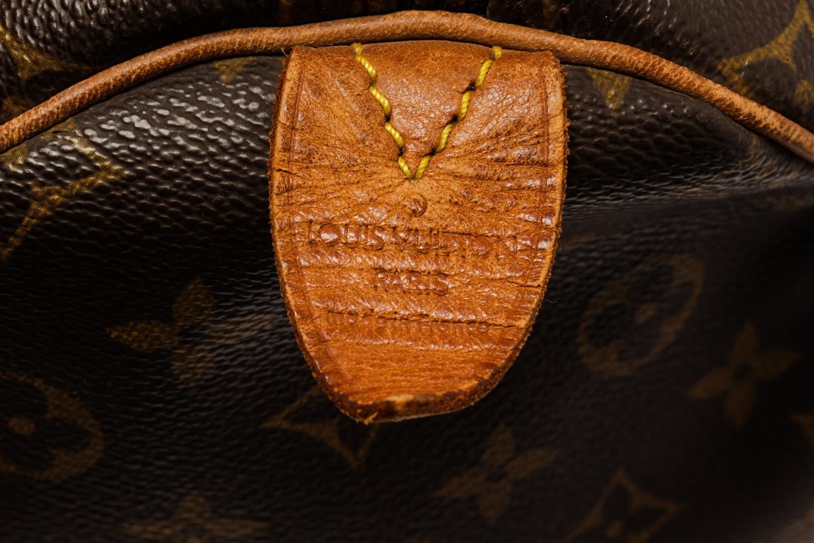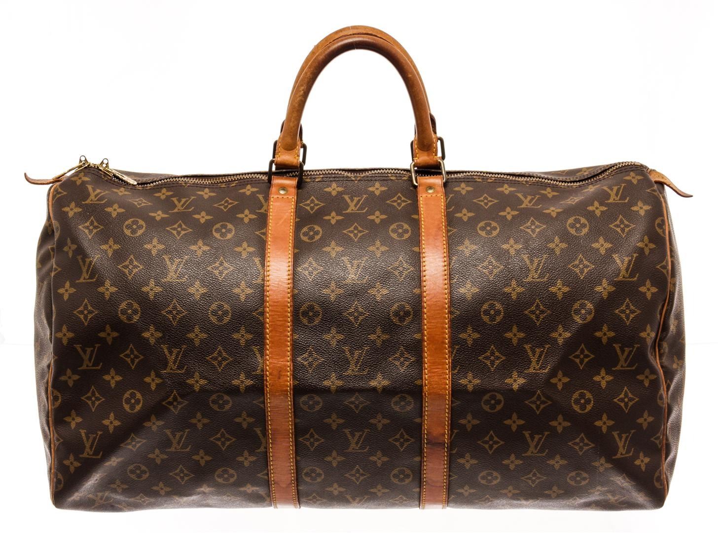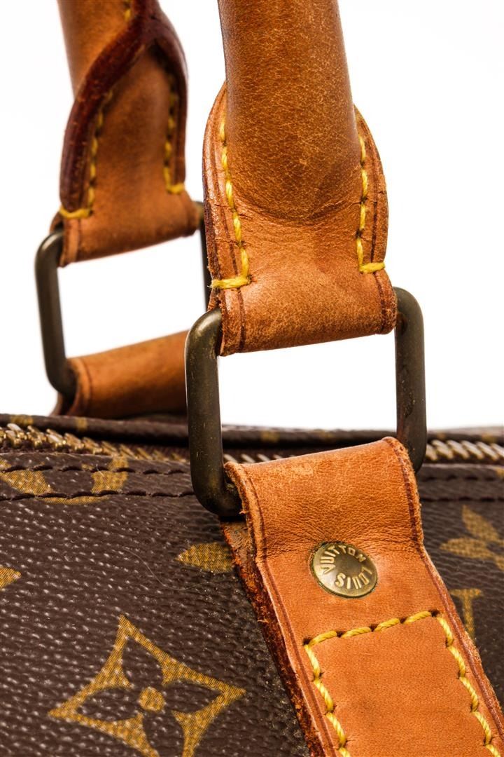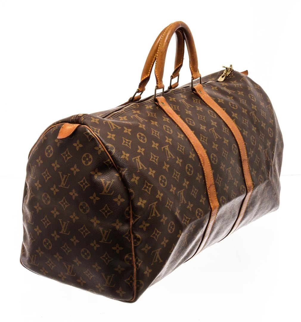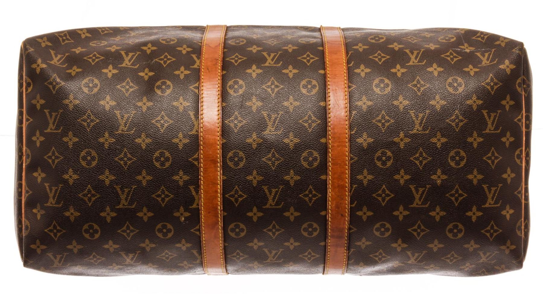 Louis Vuitton Brown Monogram Canvas Keepall 55 Travel Bag. All available information is listed in the description and shown in the photos. Louis Vuitton Brown Monogram Canvas Keepall 55 Travel Bag with gold-tone hardware, trim tan vachetta leather, brown canvas lining, leather trim inside, golden brass pieces, rounded leather handles. W55cm x H27cm x D25cm / 21.65" x 10.62" x 9.84"