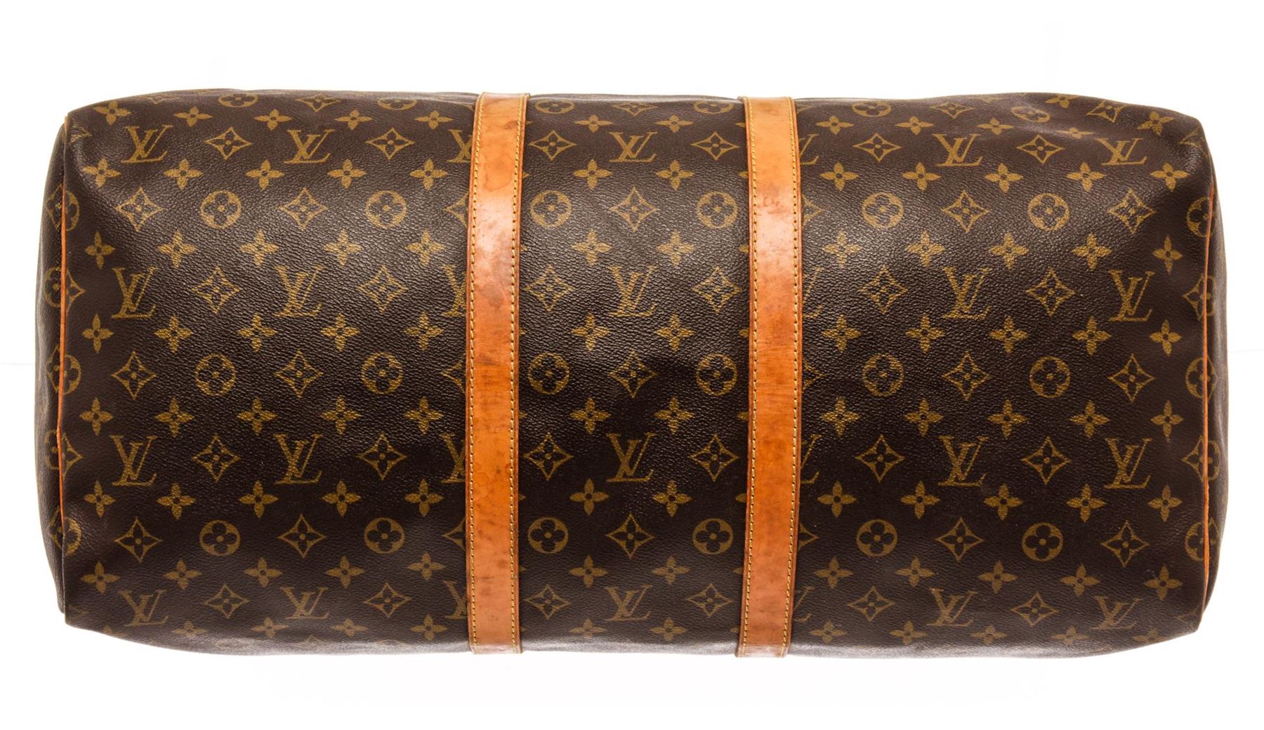 Louis Vuitton Brown Monogram Canvas Keepall 55 Travel Bag. All available information is listed in the description and shown in the photos. Louis Vuitton Brown Monogram Canvas Keepall 55 Travel Bag with gold-tone hardware, trim tan vachetta leather, brown canvas lining, leather trim inside, golden brass pieces, rounded leather handles. W55cm x H27cm x D25cm / 21.65" x 10.62" x 9.84"