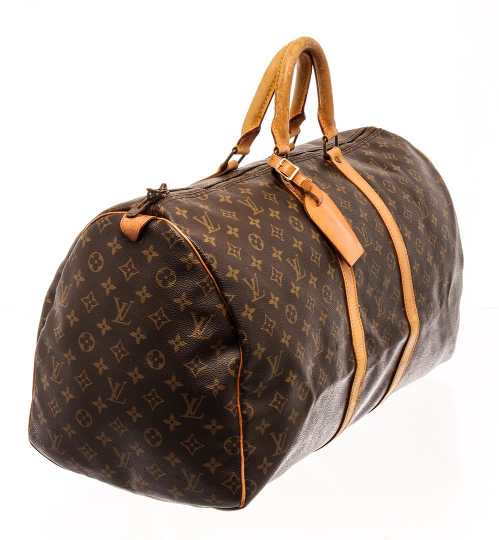 Louis Vuitton Brown Monogram Canvas Keepall 55 Travel Bag. All available information is listed in the description and shown in the photos. Louis Vuitton Brown Monogram Canvas Keepall 55 Travel Bag with gold-tone hardware, trim tan vachetta leather, brown canvas lining, leather trim inside, golden brass pieces, rounded leather handles. W55cm x H27cm x D25cm / 21.65" x 10.62" x 9.84"