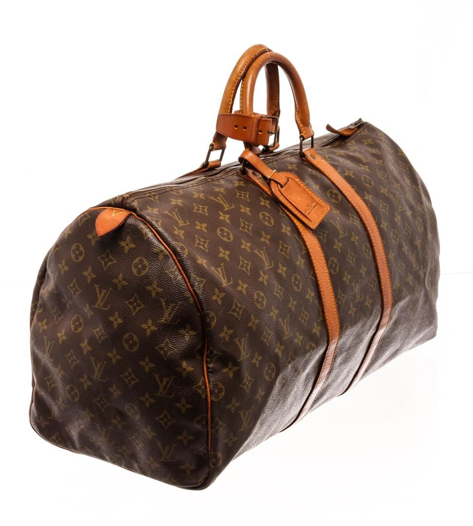 Louis Vuitton Brown Monogram Canvas Keepall 55 Travel Bag. All available information is listed in the description and shown in the photos. Louis Vuitton Brown Monogram Canvas Keepall 55 Travel Bag with gold-tone hardware, trim tan vachetta leather, brown canvas lining, leather trim inside, golden brass pieces, rounded leather handles. W55cm x H27cm x D25cm / 21.65" x 10.62" x 9.84"
