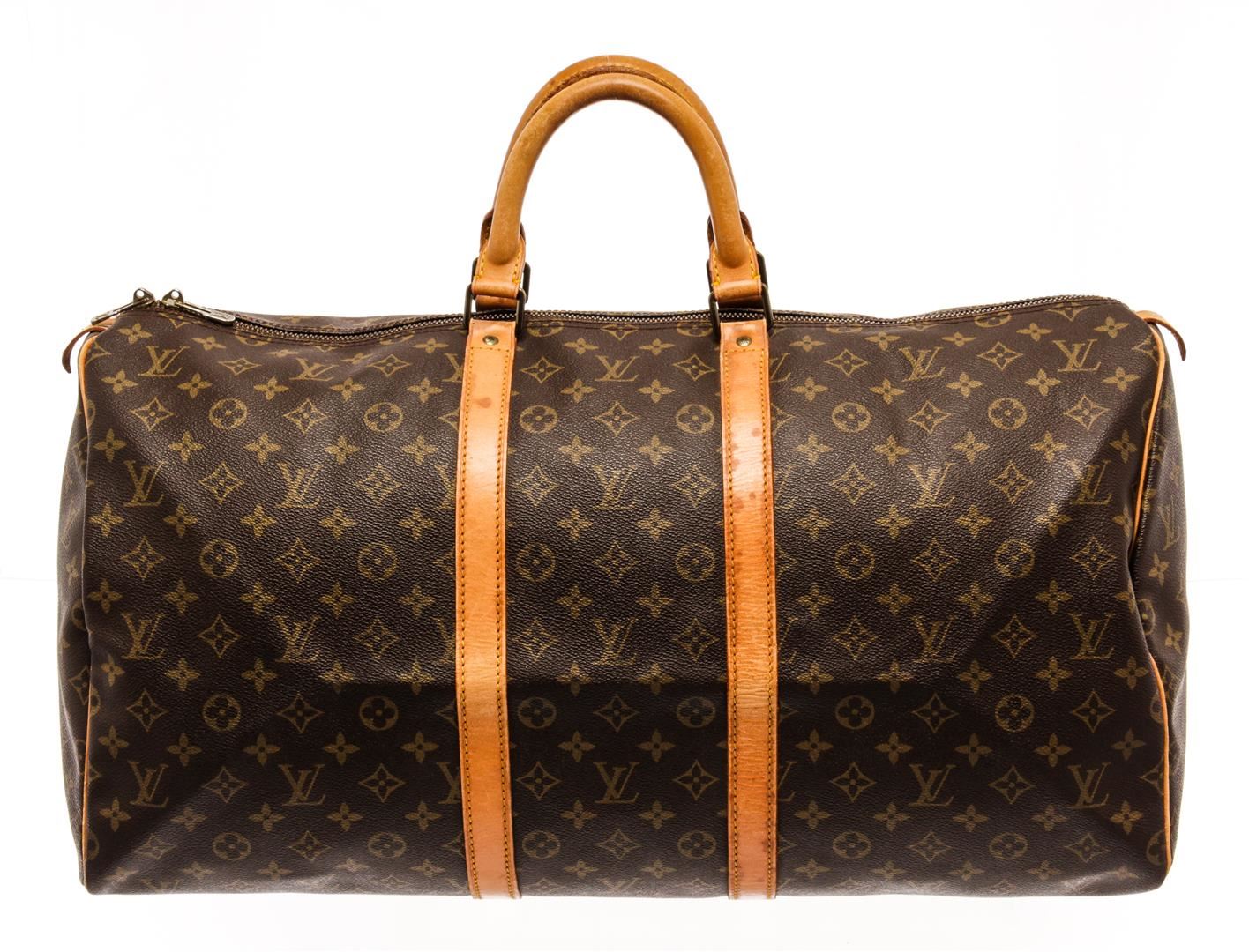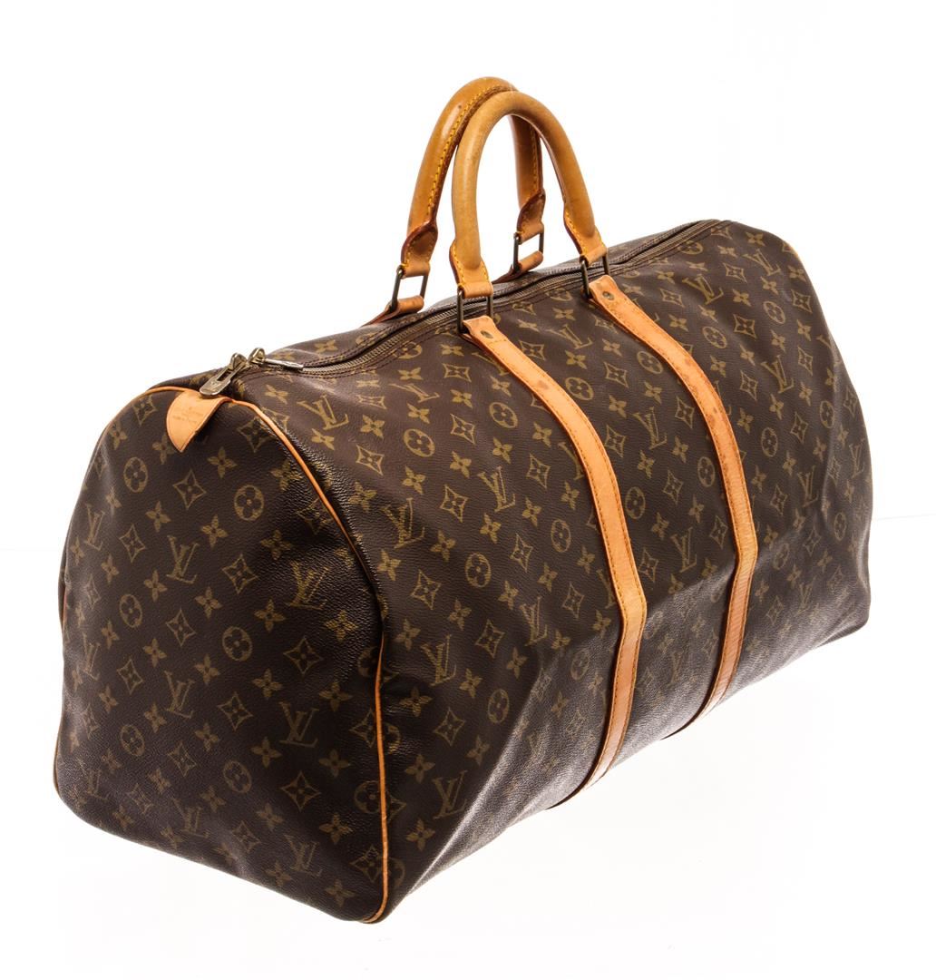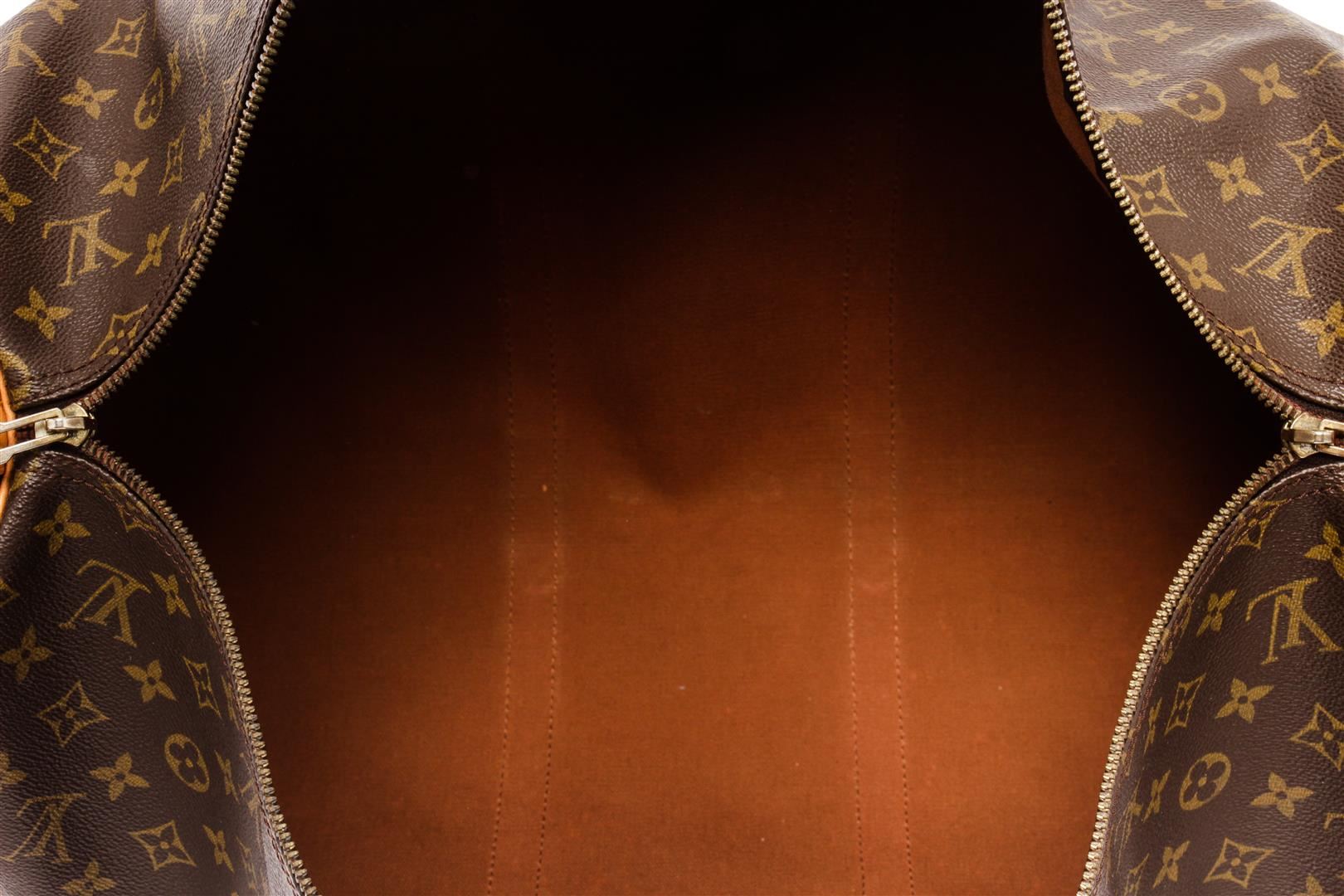 Louis Vuitton Brown Monogram Canvas Keepall 55 Travel Bag. All available information is listed in the description and shown in the photos. Louis Vuitton Brown Monogram Canvas Keepall 55 Travel Bag with gold-tone hardware, trim tan vachetta leather, brown canvas lining, leather trim inside, golden brass pieces, rounded leather handles. W55cm x H27cm x D25cm / 21.65" x 10.62" x 9.84"