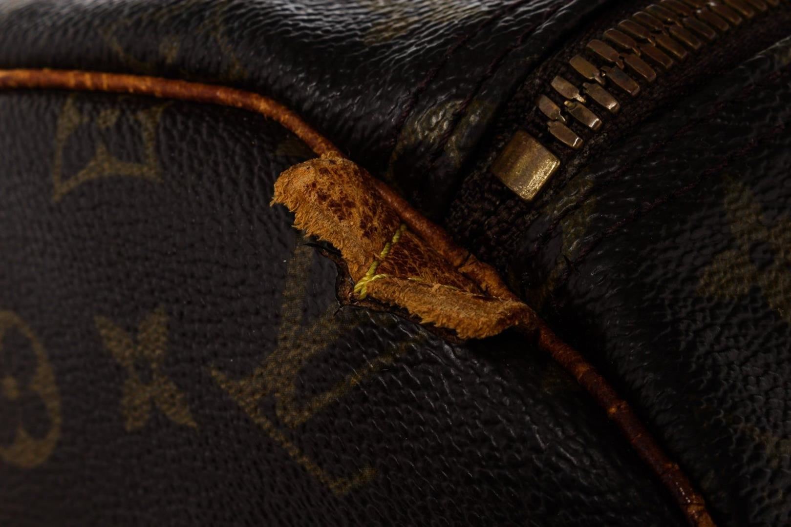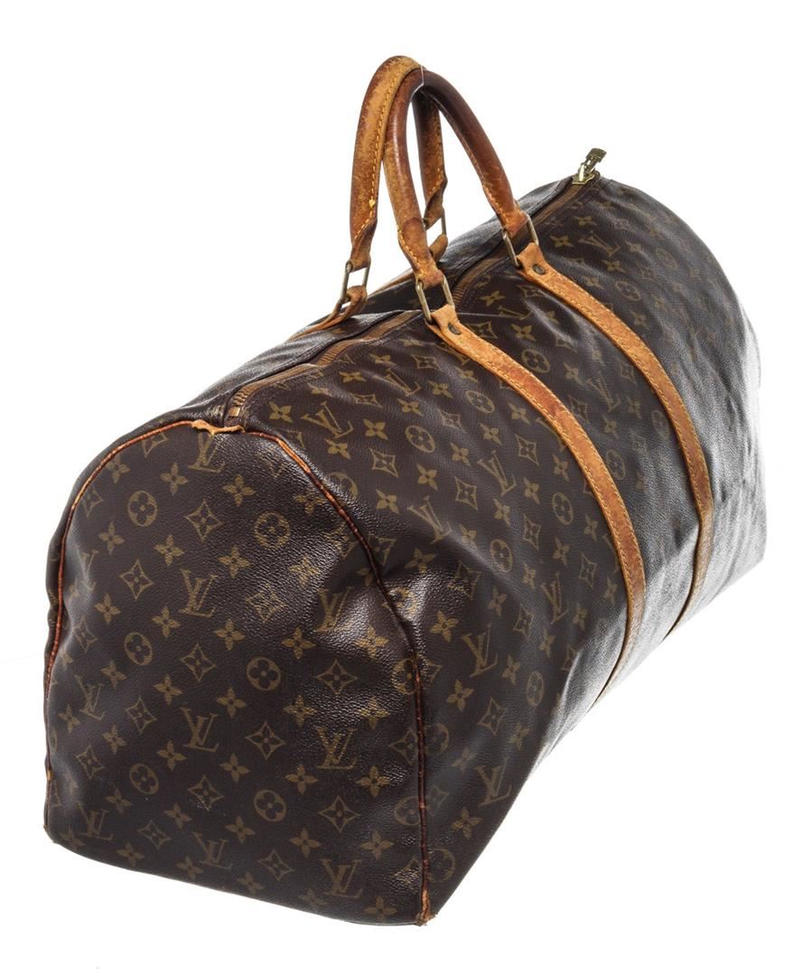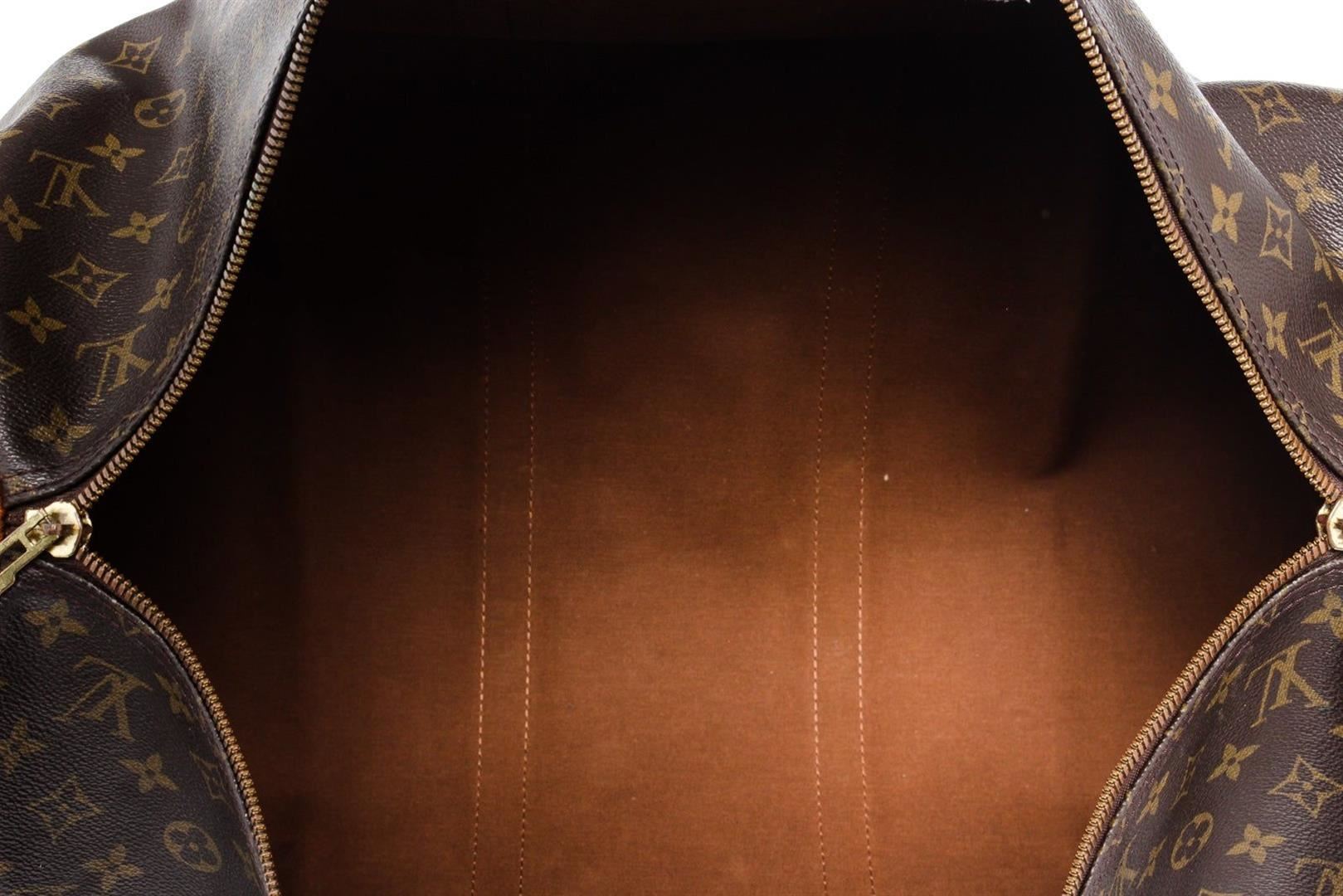 Louis Vuitton Brown Monogram Canvas Keepall 55cm Travel Bag with monogram canvas, gold-tone hardware, trim tan vachetta leather, dual top handle, shoulder strap and zipper closure.