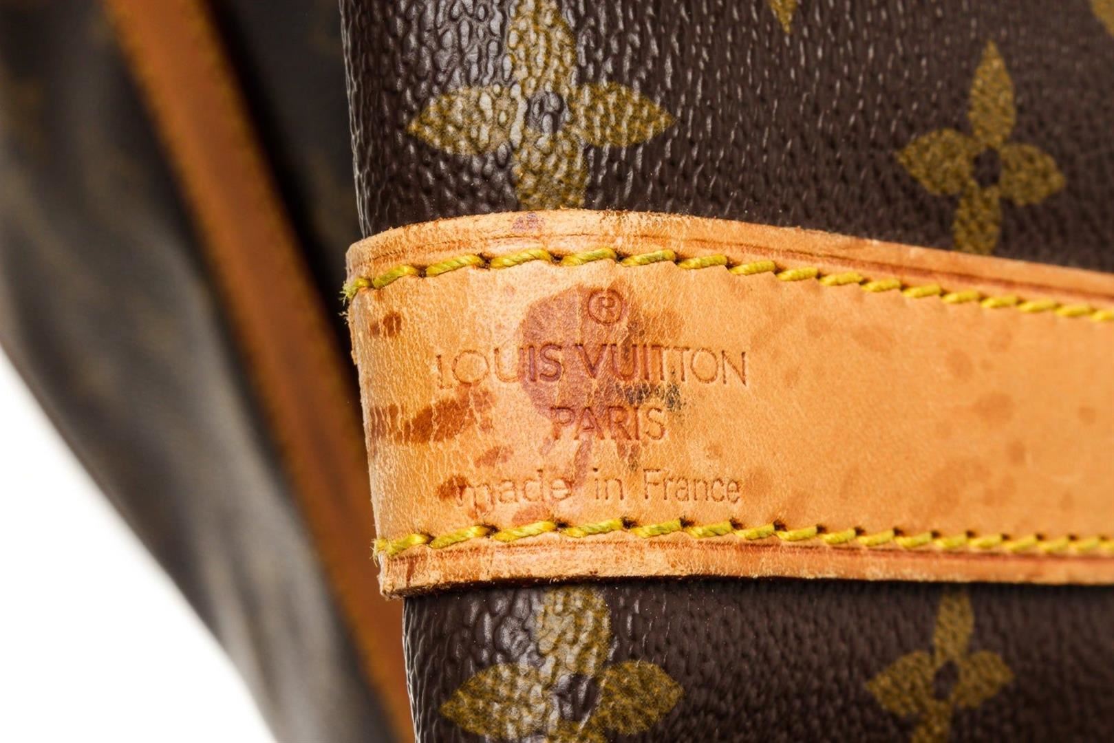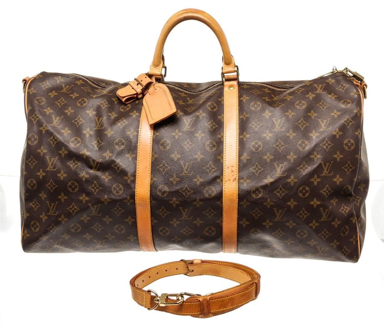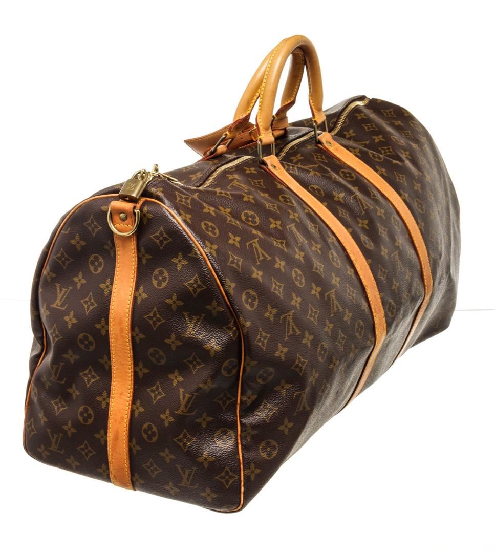 Louis Vuitton Brown Keepall 60cm Travel Bag with material monogram canvas, gold-tone hardware, trim tan vachetta leather, leather lining, dual top handle, and zipper closure.
