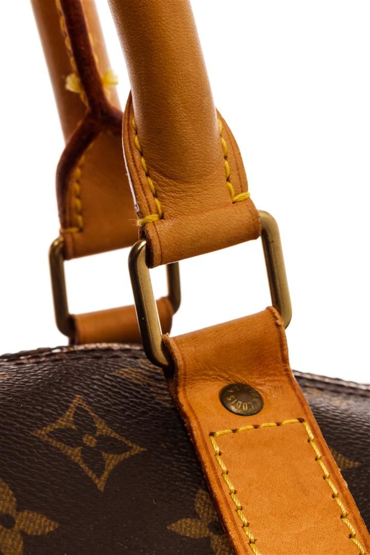 Louis Vuitton Brown Monogram Canvas Keepall Bandoulière 60 Travel Bag. All available information is listed in the description and shown in the photos. Louis Vuitton Brown Monogram Canvas Keepall Bandoulière 60 Travel Bag with brown coated canvas, brass hardware, dual rolled handles & single adjustable shoulder strap, canvas lining, zip closure at top. Height: 12" Width: 23" Depth: 10.25", Shoulder Strap Drop : 19-23" / 30.48 x 58.42 x 26.03 Cm