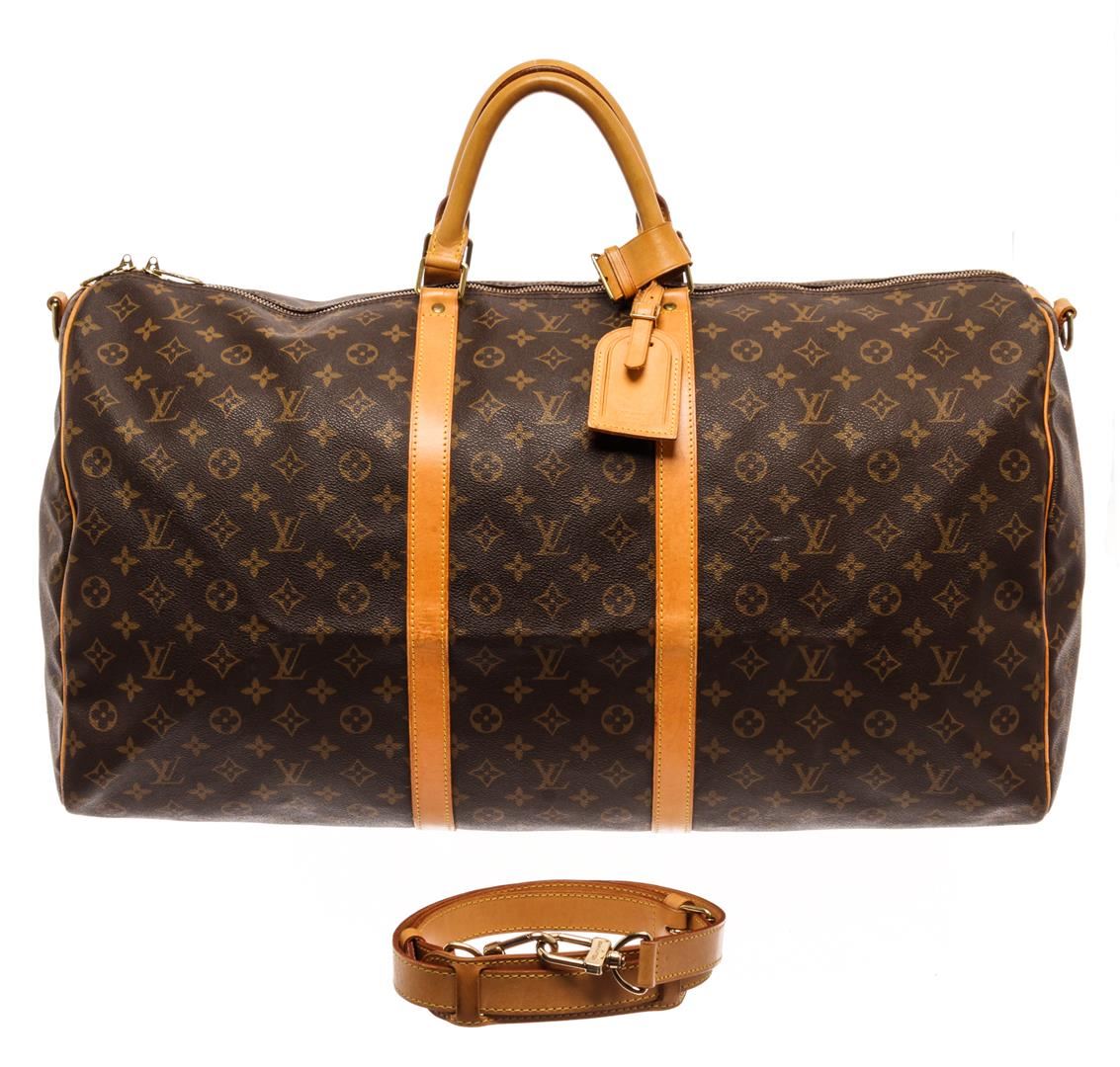 Louis Vuitton Brown Monogram Canvas Keepall Bandoulière 60 Travel Bag. All available information is listed in the description and shown in the photos. Louis Vuitton Brown Monogram Canvas Keepall Bandoulière 60 Travel Bag with brown coated canvas, brass hardware, dual rolled handles & single adjustable shoulder strap, canvas lining, zip closure at top. Height: 12" Width: 23" Depth: 10.25", Shoulder Strap Drop : 19-23" / 30.48 x 58.42 x 26.03 Cm