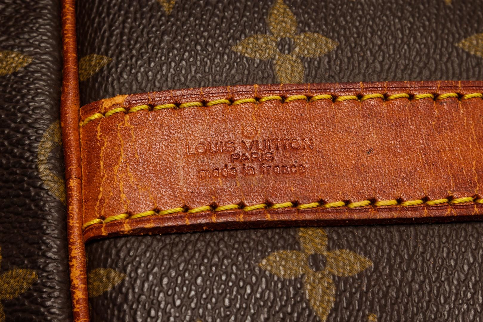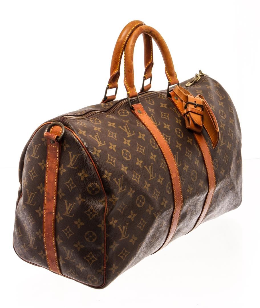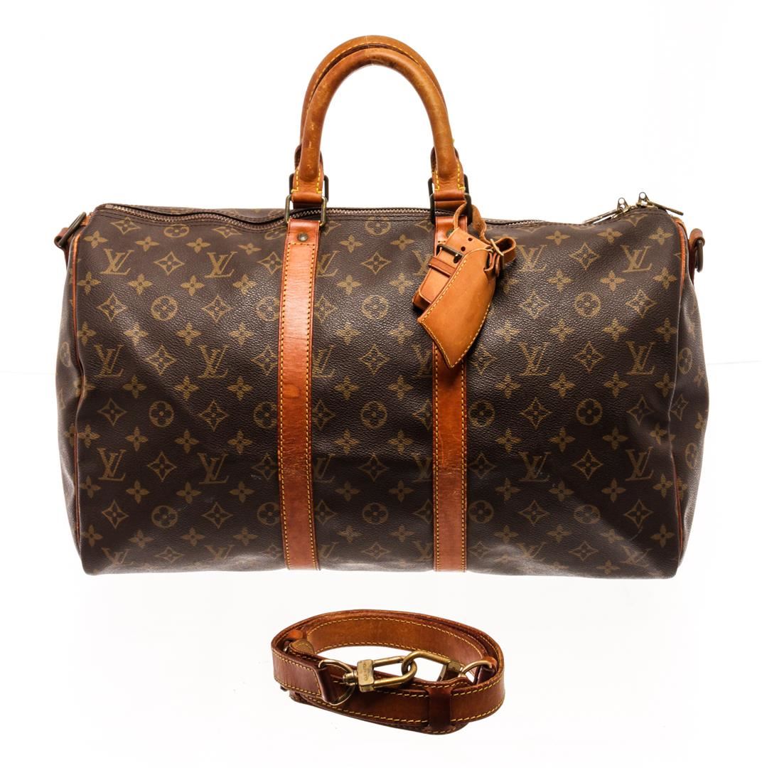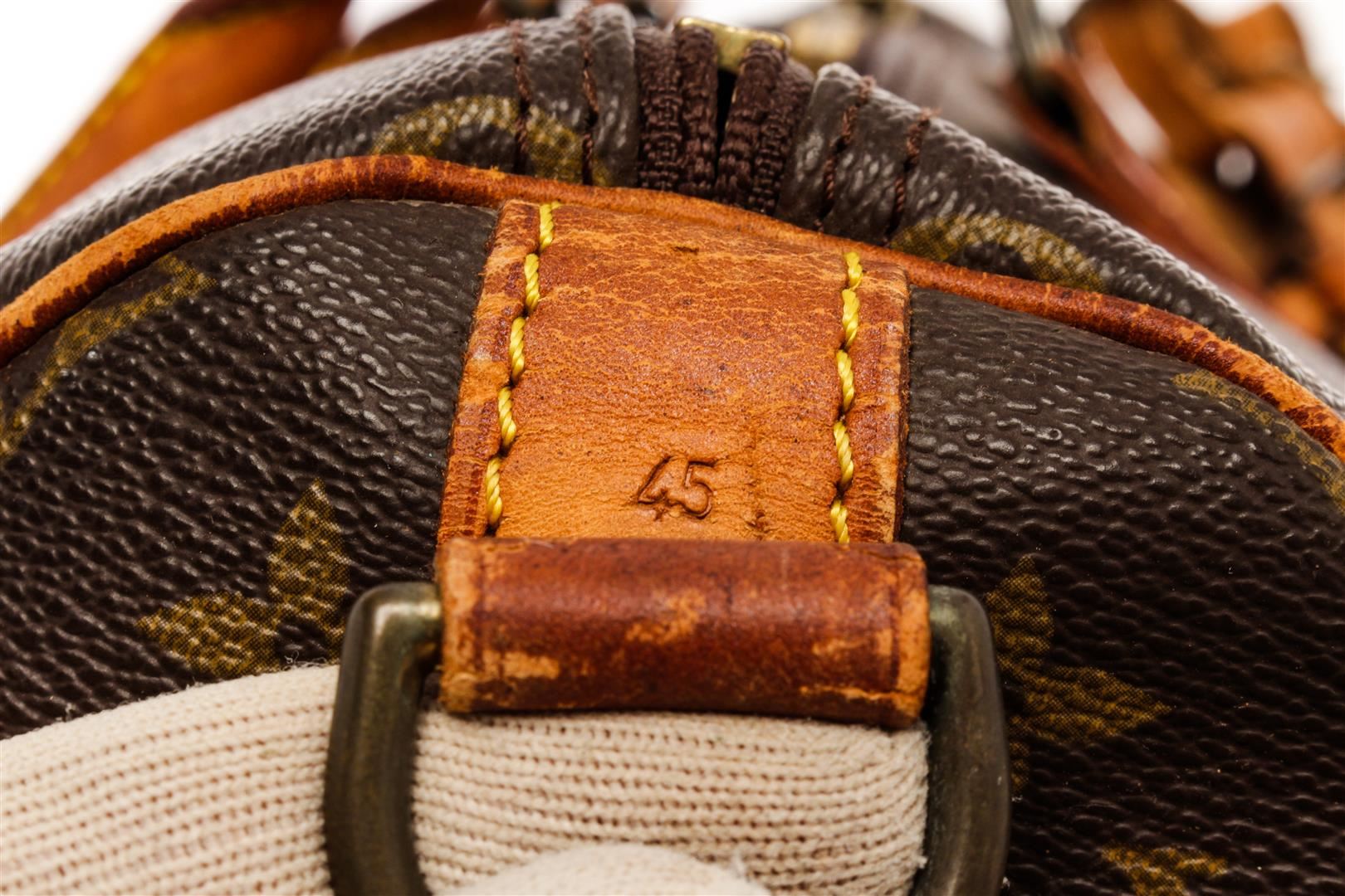 Louis Vuitton Brown Monogram Canvas Keepall Bandouliere 45 Travel Bag. All available information is listed in the description and shown in the photos. Louis Vuitton Keepall Bandouliere 45 cm duffel bag with monogram coated canvas exterior, contrasting vanchetta leather trims and top handles, brown fabric lining, top zipper closure, lock, gold-tone hardware, and adjustable and detachable strap. Height: 10.7 in (27.18 cm), Width: 7.9 in (20.07 cm), Depth: 17.8 in (45.22 cm)