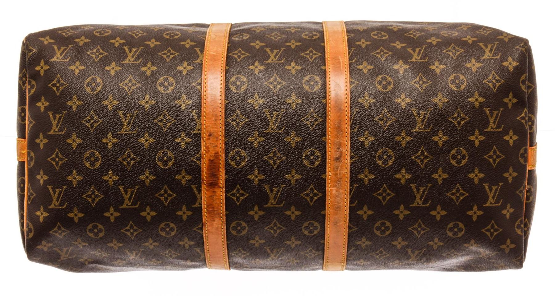 Louis Vuitton Brown Monogram Canvas Keepall Bandouliere 50 Travel Bag. All available information is listed in the description and shown in the photos. Louis Vuitton Brown Monogram Canvas Keepall Bandouliere 50 Travel Bag with a monogram canvas body, rolled leather handles, a detachable shoulder strap, and a top zip closure. 10.8" L x 19.5" W x 8.3" D / 27.43 x 49.53 x 21.08 CM