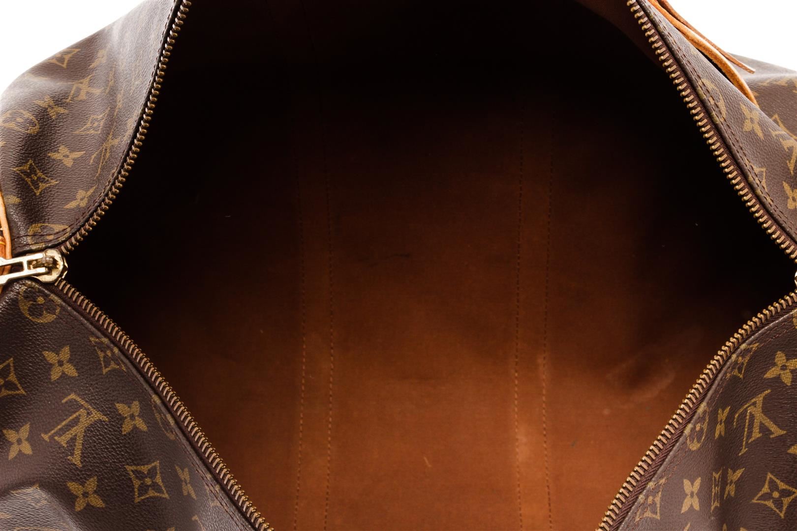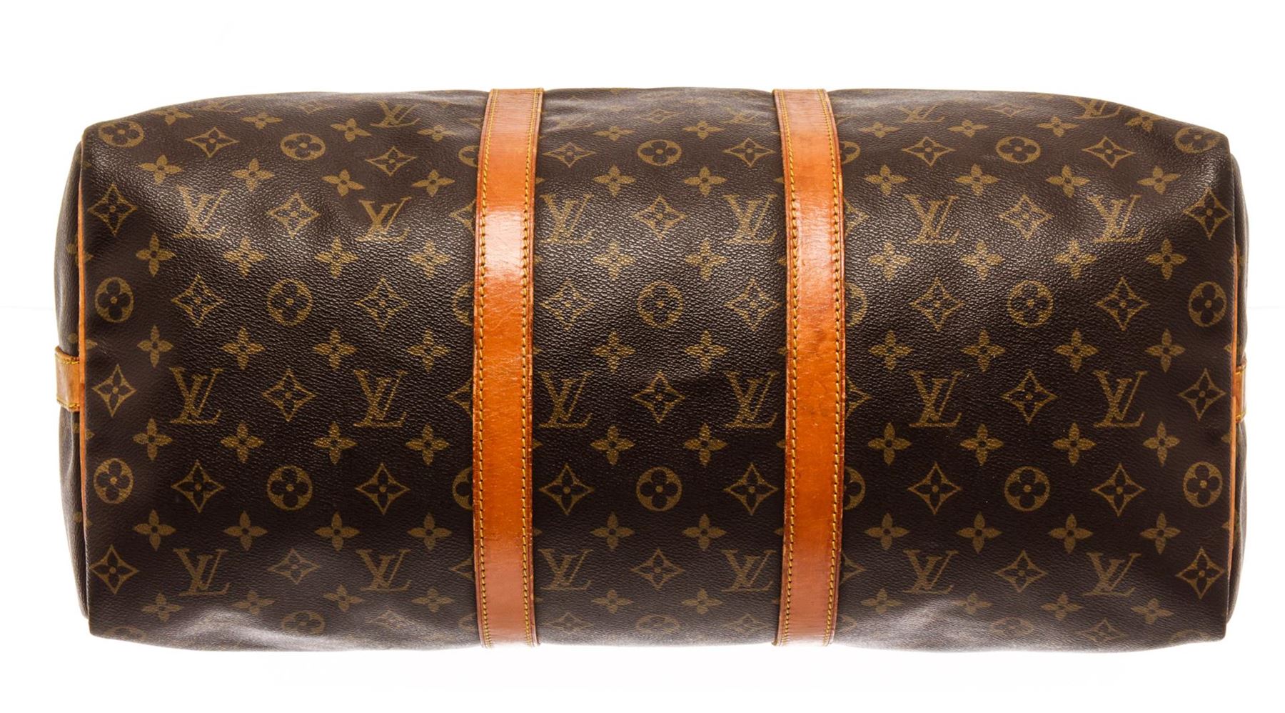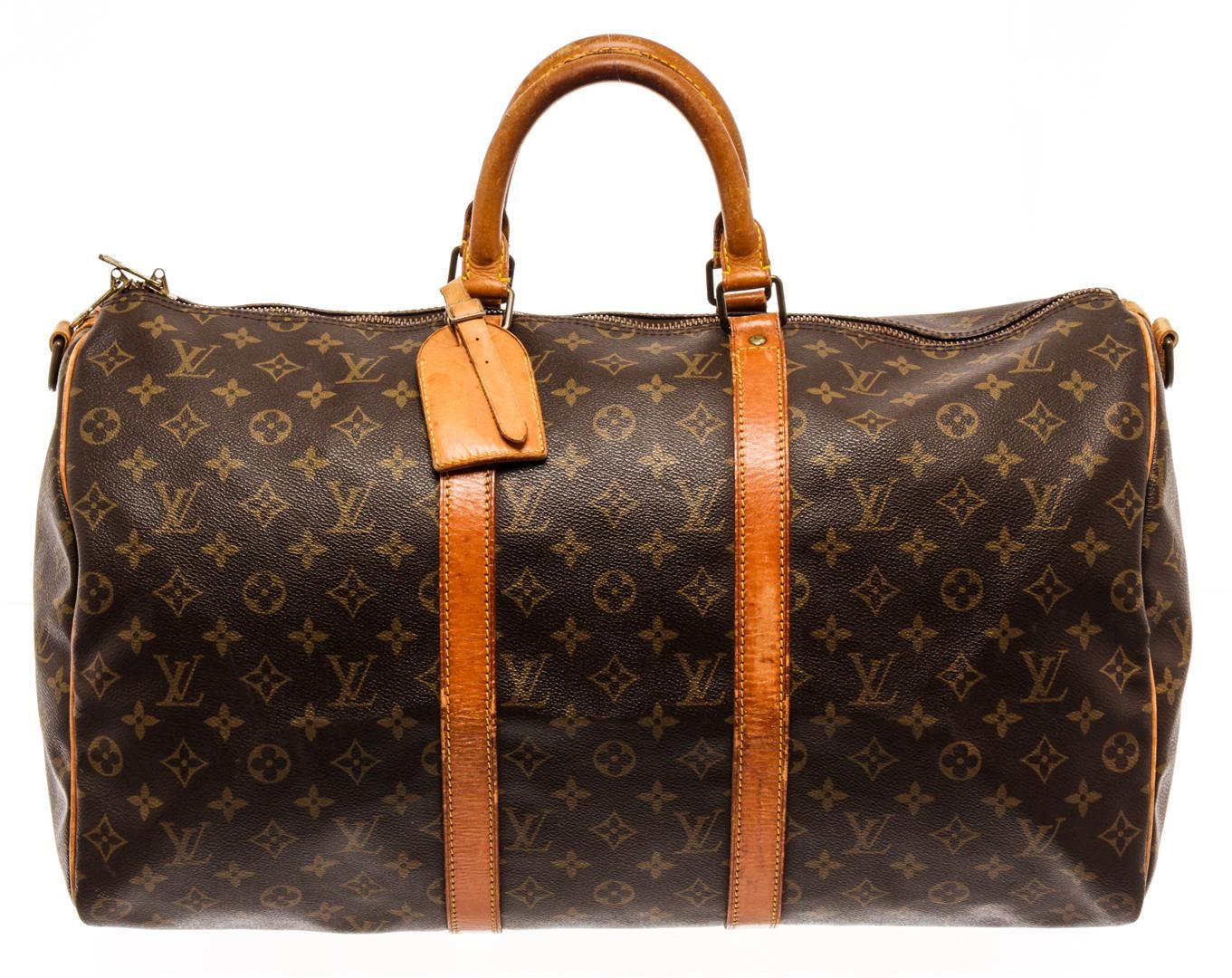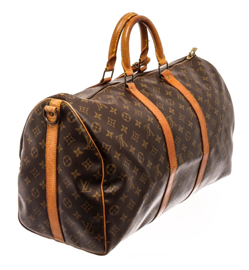 Louis Vuitton Brown Monogram Canvas Keepall Bandouliere 50 Travel Bag. All available information is listed in the description and shown in the photos. Louis Vuitton Brown Monogram Canvas Keepall Bandouliere 50 Travel Bag with a monogram canvas body, rolled leather handles, a detachable shoulder strap, and a top zip closure. 10.8" L x 19.5" W x 8.3" D / 27.43 x 49.53 x 21.08 CM