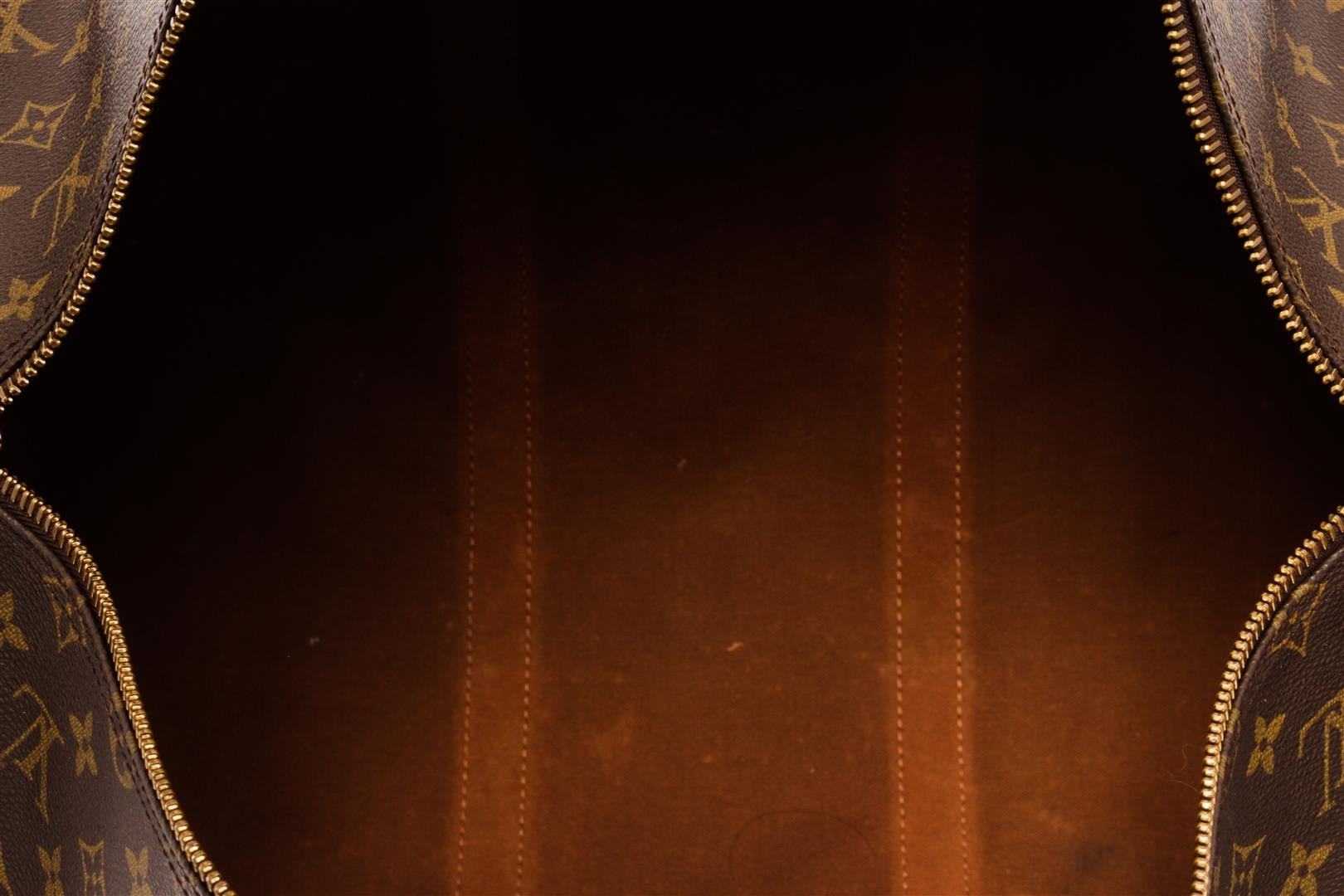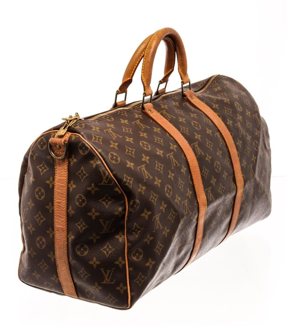 Louis Vuitton Brown Monogram Canvas Keepall Bandouliere 50 Travel Bag. All available information is listed in the description and shown in the photos. Louis Vuitton Brown Monogram Canvas Keepall Bandouliere 50 Travel Bag with a monogram canvas body, rolled leather handles, a detachable shoulder strap, and a top zip closure. 10.8" L x 19.5" W x 8.3" D / 27.43 x 49.53 x 21.08 CM