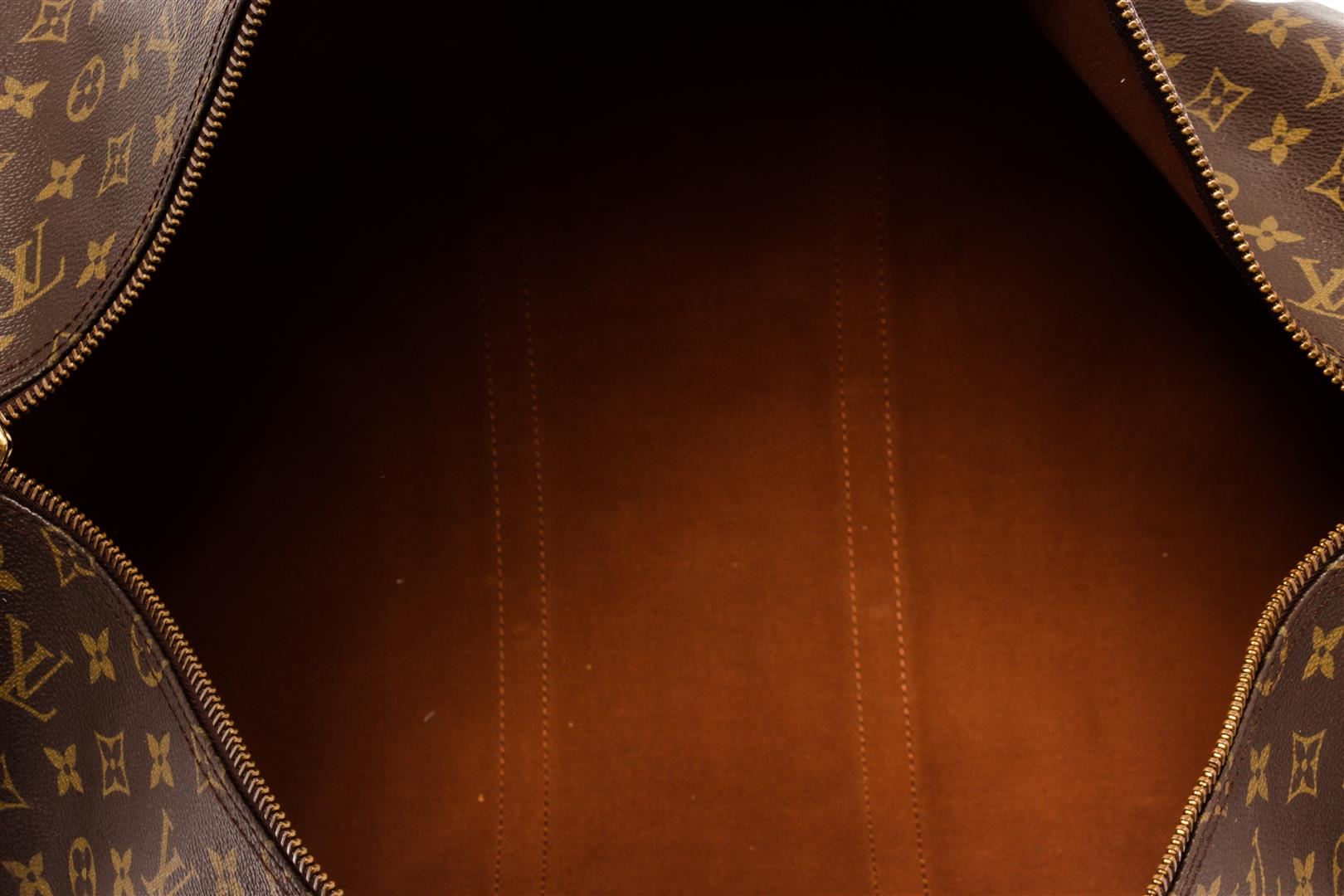 Louis Vuitton Brown Monogram Canvas Keepall Bandouliere 50 Travel Bag. All available information is listed in the description and shown in the photos. Louis Vuitton Brown Monogram Canvas Keepall Bandouliere 50 Travel Bag with a monogram canvas body, rolled leather handles, a detachable shoulder strap, and a top zip closure. 10.8" L x 19.5" W x 8.3" D / 27.43 x 49.53 x 21.08 CM