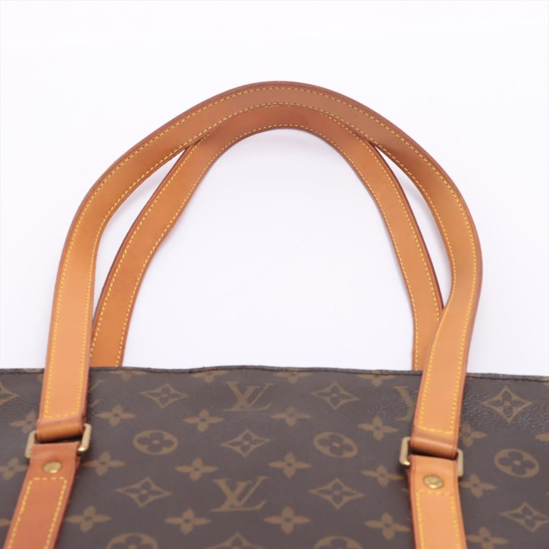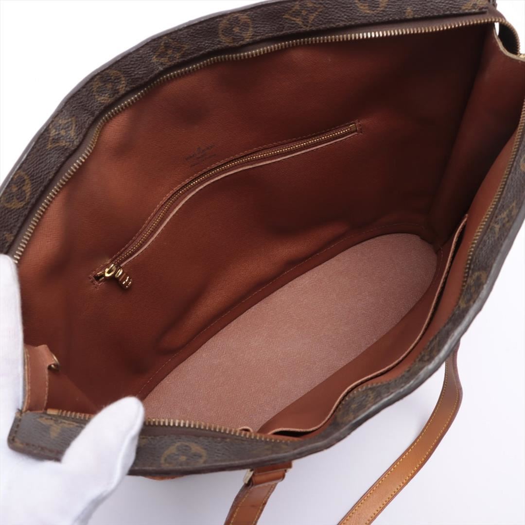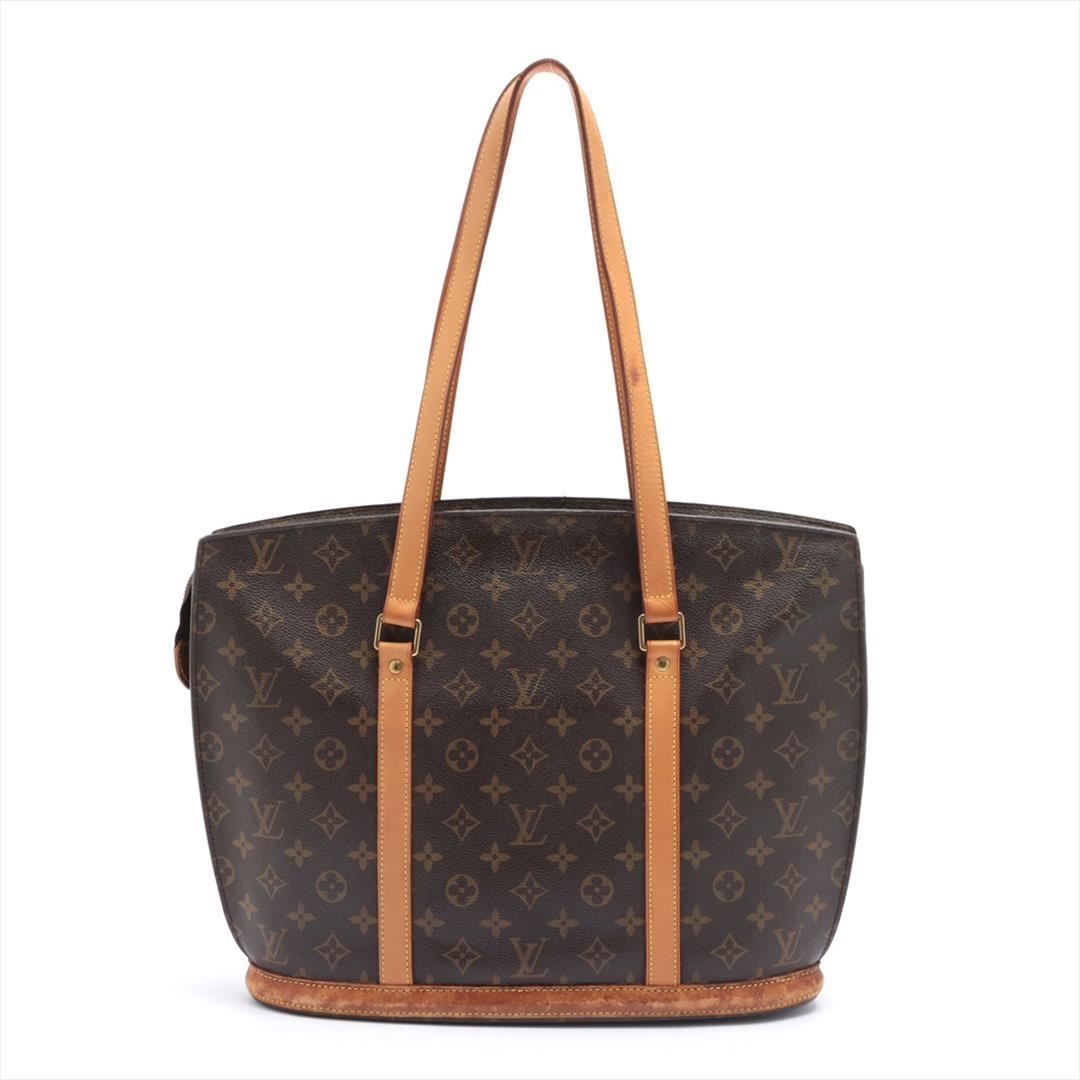 Brown and tan monogram coated canvas Louis Vuitton Babylone tote with brass hardware, tan vachetta leather trim, dual flat shoulder straps, beige Alcantara lining, dual pockets at interior walls; one with zip closure and zip closure at top. 6 15.5"