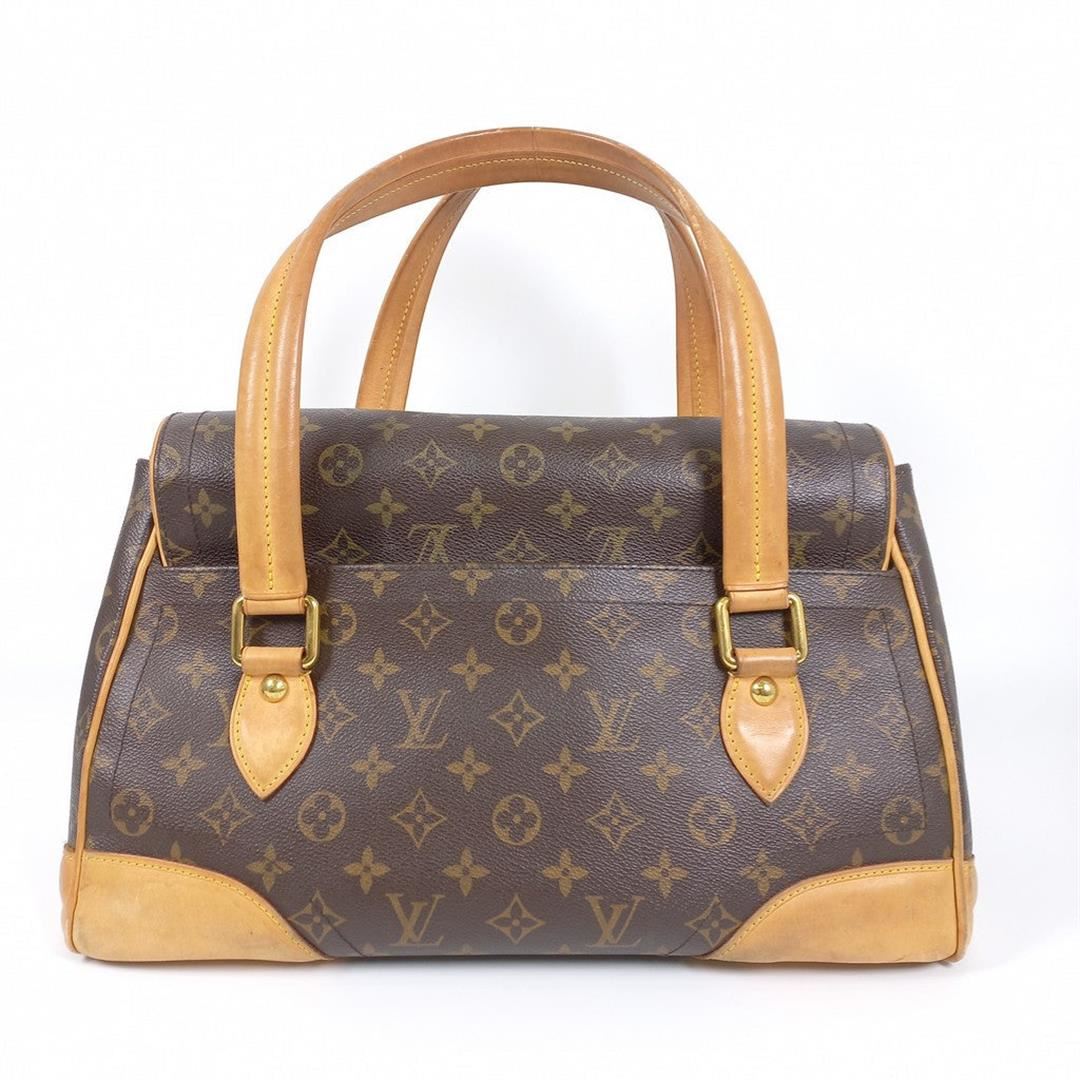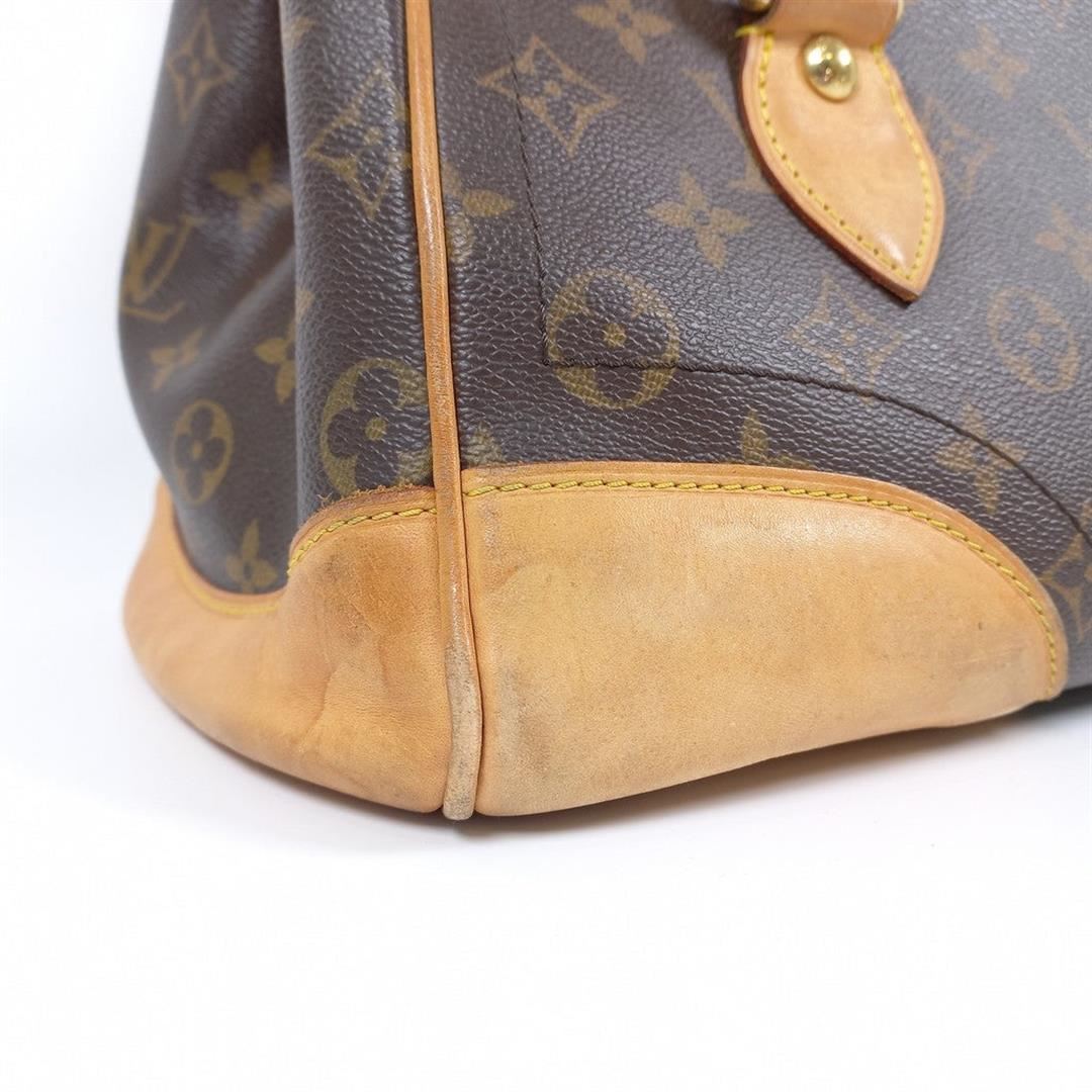 Louis Vuitton Brown Monogram Canvas Leather Beverly GM Shoulder Bag. All available information is listed in the description and shown in the photos. Brown and tan monogram coated canvas Louis Vuitton Beverly GM with gold-tone hardware, tan vachetta leather accents, dual flat shoulder straps, exterior pocket at back, beige Alcantara lining, dual pockets at interior walls; one with snap closure and push-lock closure at front flap. 14"x7"x8"xBag Drop:7.25"/10.1cmx17.7cmx20.3cmxBag Drop:18.4cm