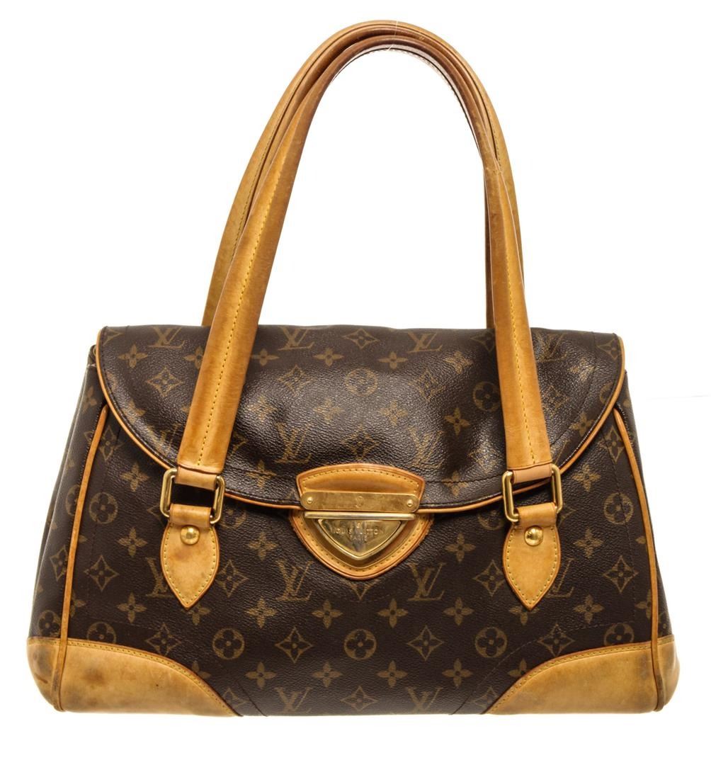 One Louis Vuitton Brown Monogram Canvas Leather Beverly GM Shoulder Bag. Item is sold AS-IS. All available information is listed in the description and shown in the photo. Brown and tan monogram coated canvas Louis Vuitton Beverly GM with gold-tone hardware, tan vachetta leather accents, dual flat shoulder straps, exterior pocket at back, beige Alcantara lining, dual pockets at interior walls; one with snap closure and push-lock closure at front flap.
