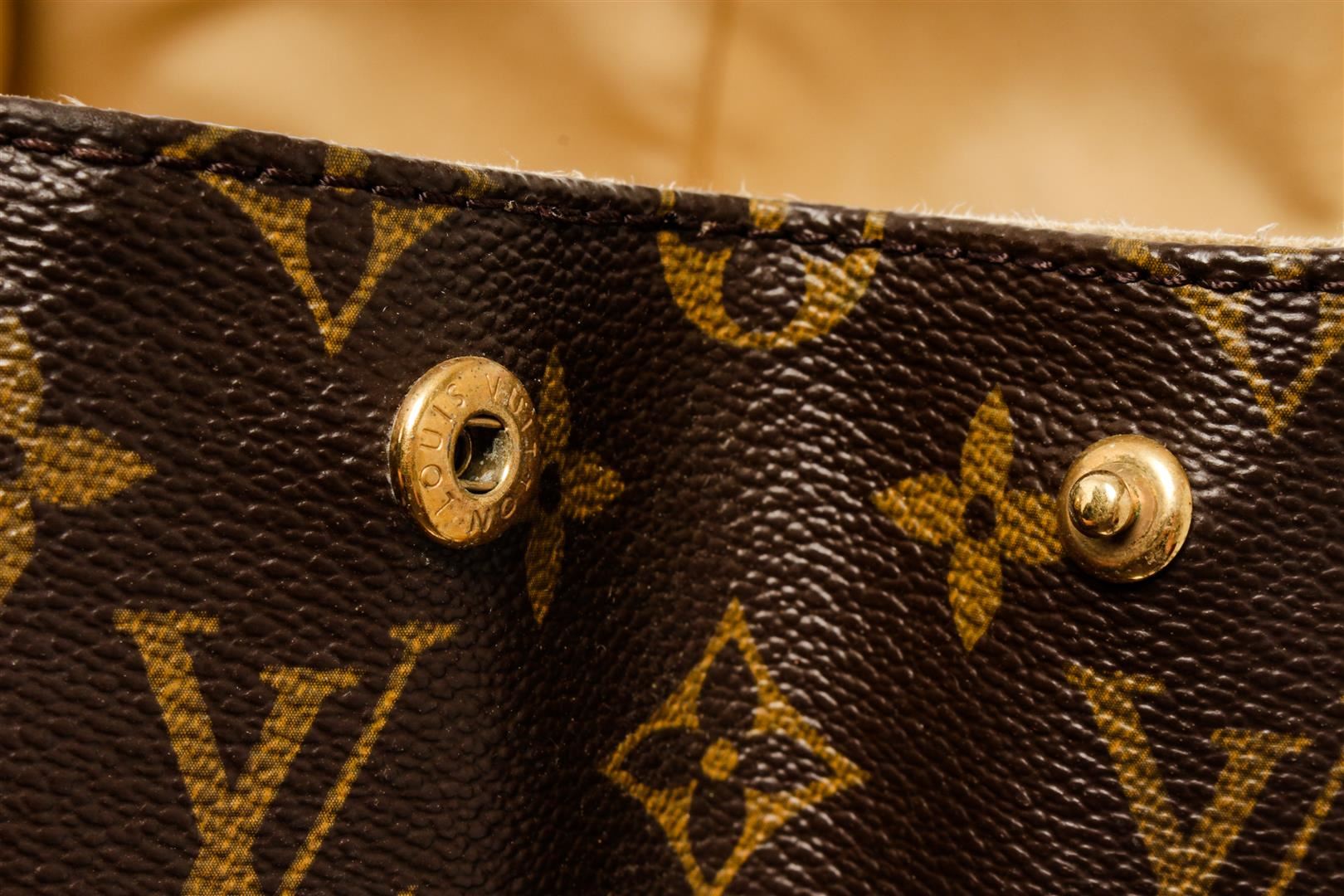 One Louis Vuitton Brown Monogram Canvas Leather Beverly GM Shoulder Bag. Item is sold AS-IS. All available information is listed in the description and shown in the photo. Brown and tan monogram coated canvas Louis Vuitton Beverly GM with gold-tone hardware, tan vachetta leather accents, dual flat shoulder straps, exterior pocket at back, beige Alcantara lining, dual pockets at interior walls; one with snap closure and push-lock closure at front flap.