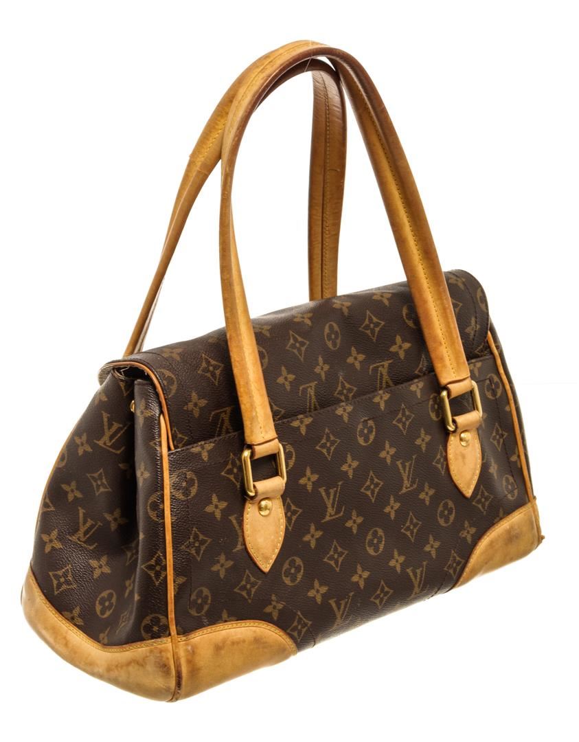 One Louis Vuitton Brown Monogram Canvas Leather Beverly GM Shoulder Bag. Item is sold AS-IS. All available information is listed in the description and shown in the photo. Brown and tan monogram coated canvas Louis Vuitton Beverly GM with gold-tone hardware, tan vachetta leather accents, dual flat shoulder straps, exterior pocket at back, beige Alcantara lining, dual pockets at interior walls; one with snap closure and push-lock closure at front flap.
