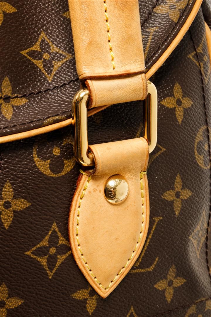 One Louis Vuitton Brown Monogram Canvas Leather Beverly GM Shoulder Bag. Item is sold AS-IS. All available information is listed in the description and shown in the photo. Brown and tan monogram coated canvas Louis Vuitton Beverly GM with gold-tone hardware, tan vachetta leather accents, dual flat shoulder straps, exterior pocket at back, beige Alcantara lining, dual pockets at interior walls; one with snap closure and push-lock closure at front flap.