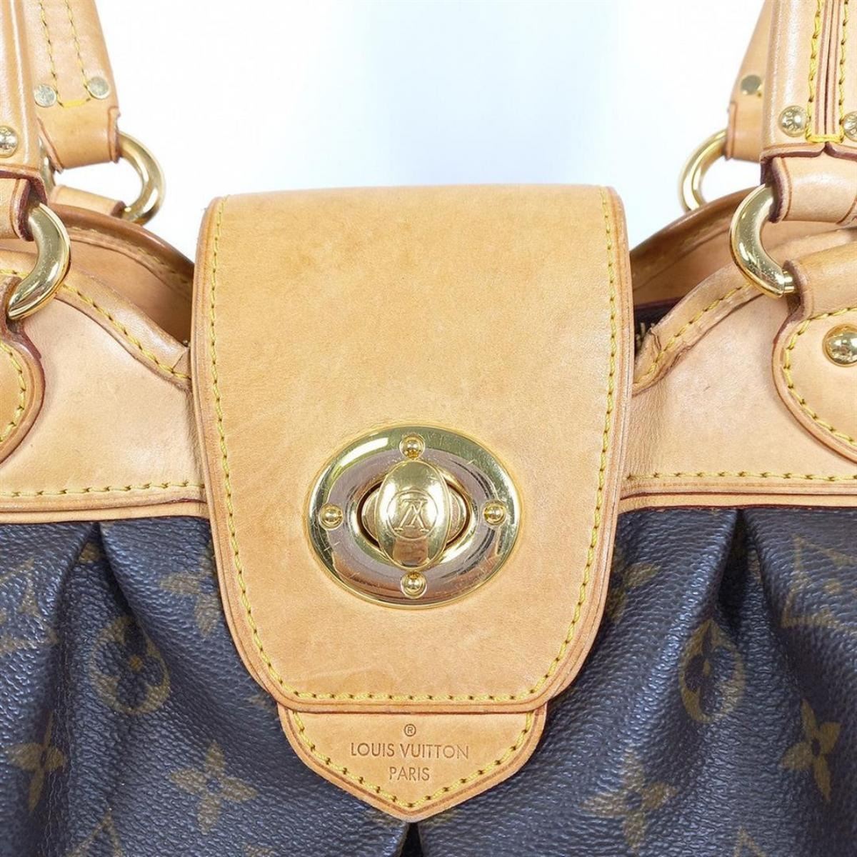 Brown and tan Monogram coated canvas Louis Vuitton Boetie MM handbag with tan Vachetta leather trim, gold-tone hardware, beige Alcantara microfiber lining, dual slip pockets at interior walls, dual flat leather handles, zip closure at top as well as turn-