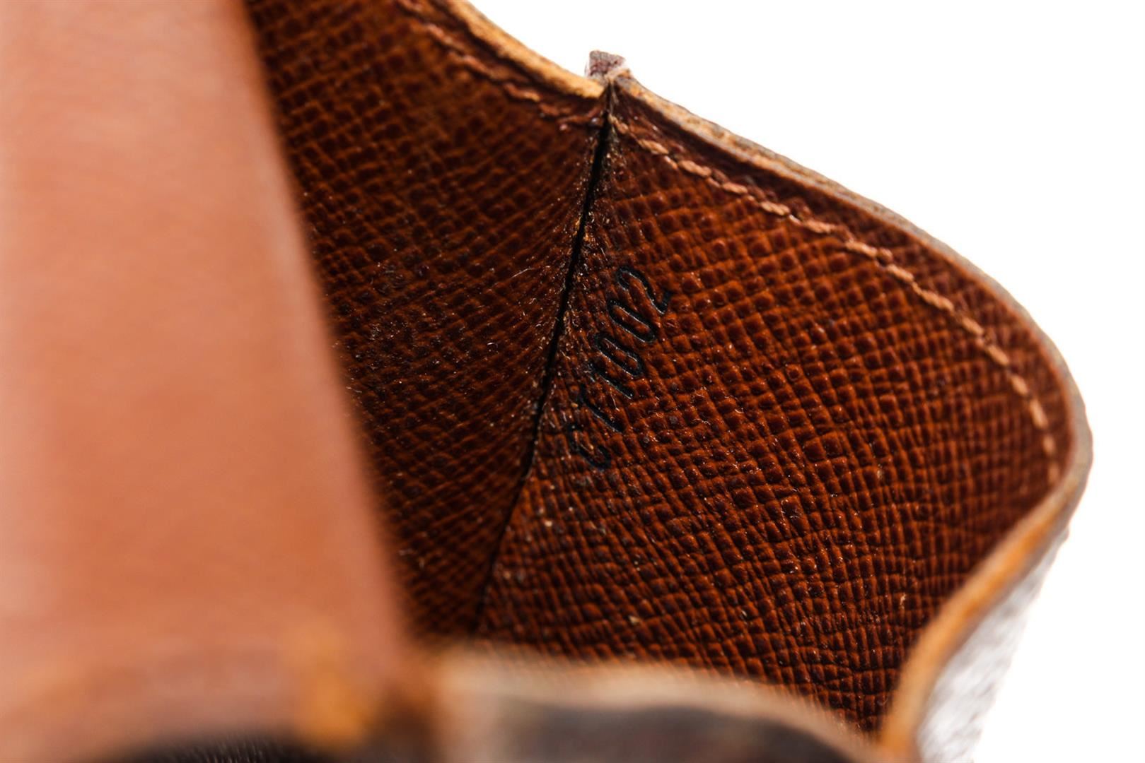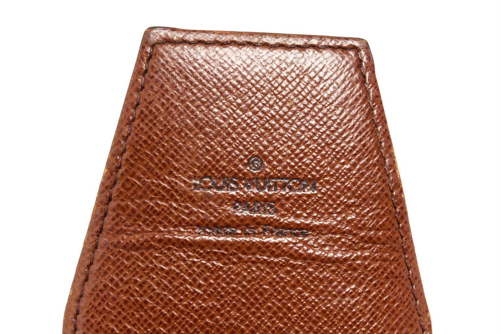 Brown and tan monogram coated canvas Louis Vuitton cigarette holder with leather lining and tab insert flap closure at front. 2.6"x4.7"x 1"/6.6cmx12cmx2.54cm
