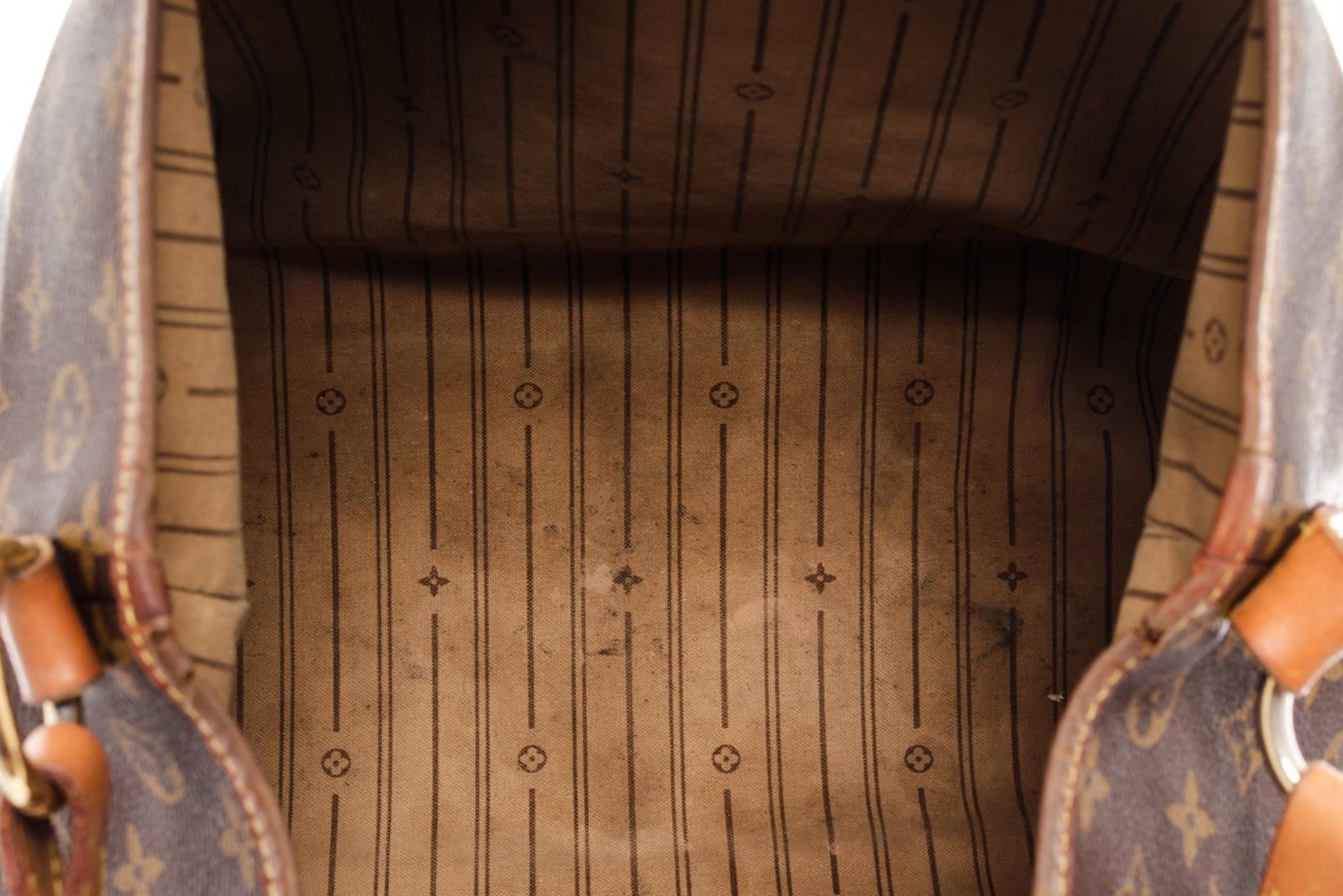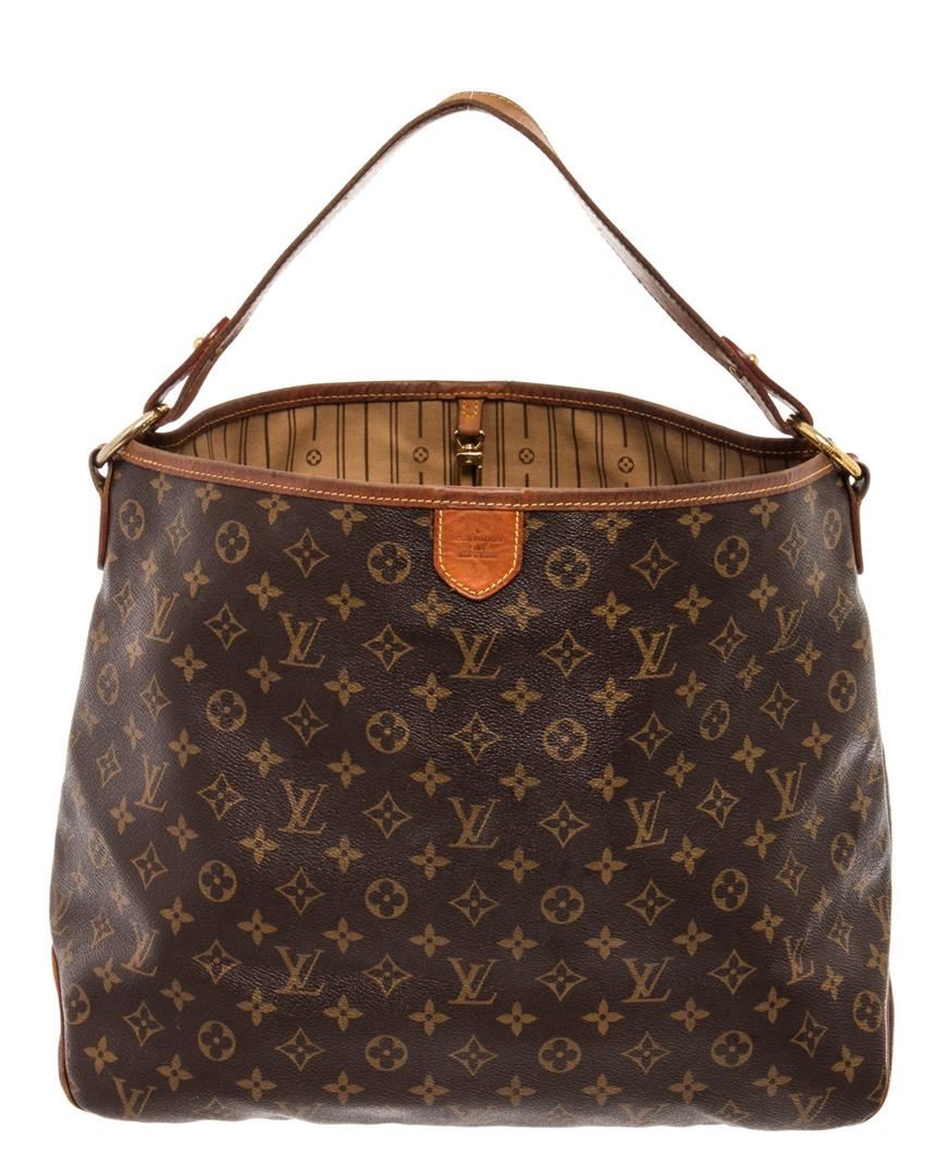 Brown and tan monogram coated canvas Louis Vuitton Delightful MM bag with gold-tone hardware, tan vachetta leather trim throughout, single embossed flat shoulder strap, brown and tan striped canvas lining, single zip pocket at interior wall and clasp clos
