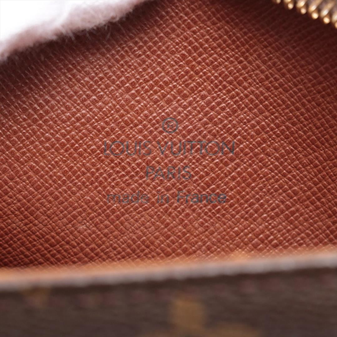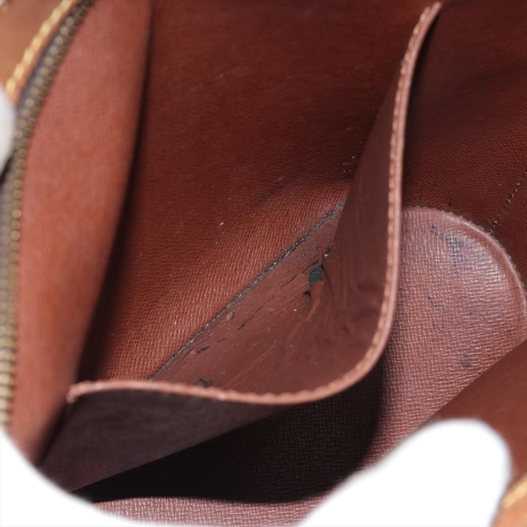Brown and tan monogram coated canvas Louis Vuitton Drouot bag with brass hardware, tan vachetta leather trim, single adjustable shoulder strap, brown Taiga leather interior, single slit pocket at interior wall and zip closure at top. 6 9.75"x4"8.