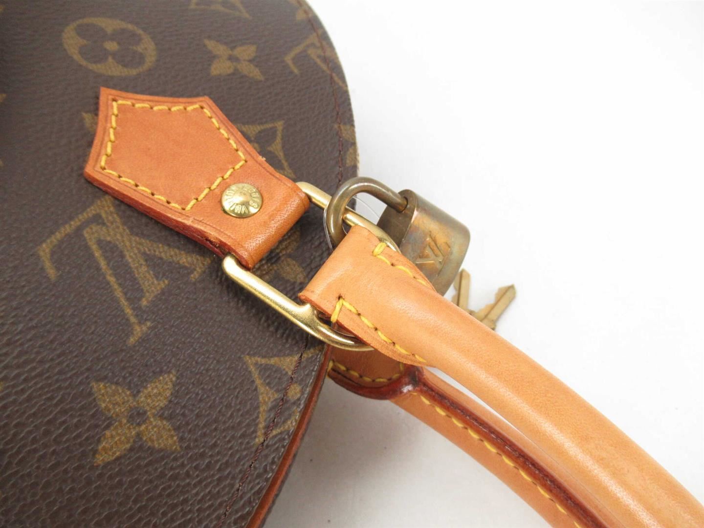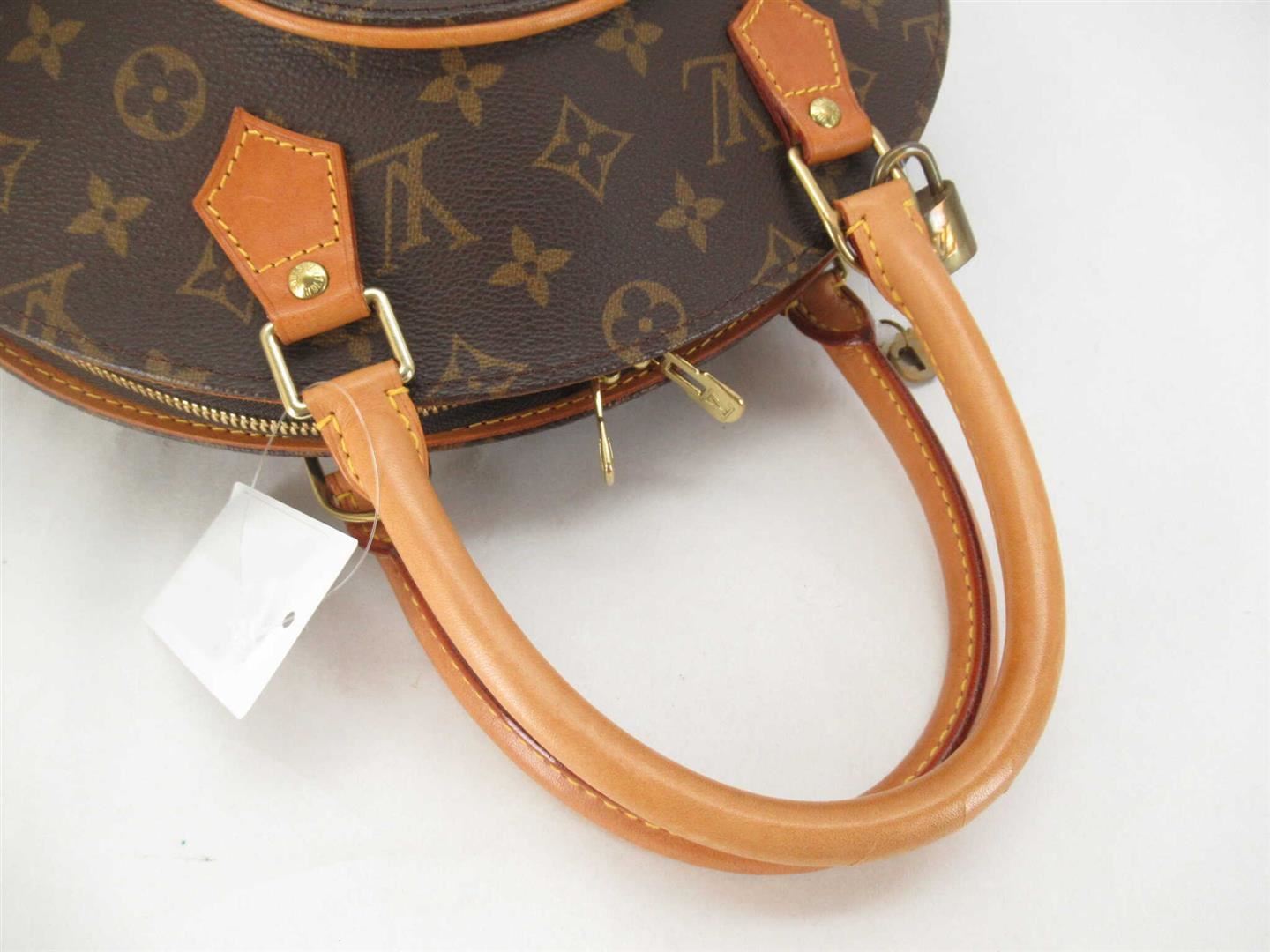 One Louis Vuitton Brown Monogram Canvas Leather Ellipse PM Handbag. Item is sold AS-IS. All available information is listed in the description and shown in the photo. Brown and tan monogram coated canvas Louis Vuitton Ellipse PM with gold-tone hardware, tan vachetta leather trim, dual rolled handles, brown canvas lining, single slit pocket at interior wall and zip closure at top. Height: 10" Width: 13.25" Depth: 2.5" Handle Drop: 4"