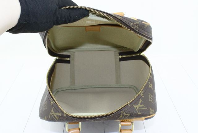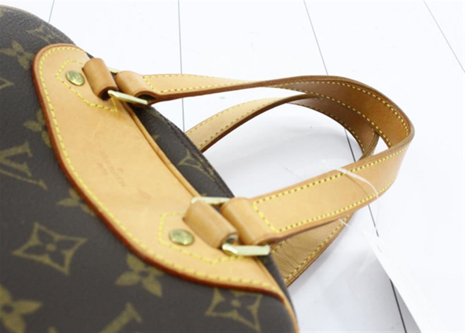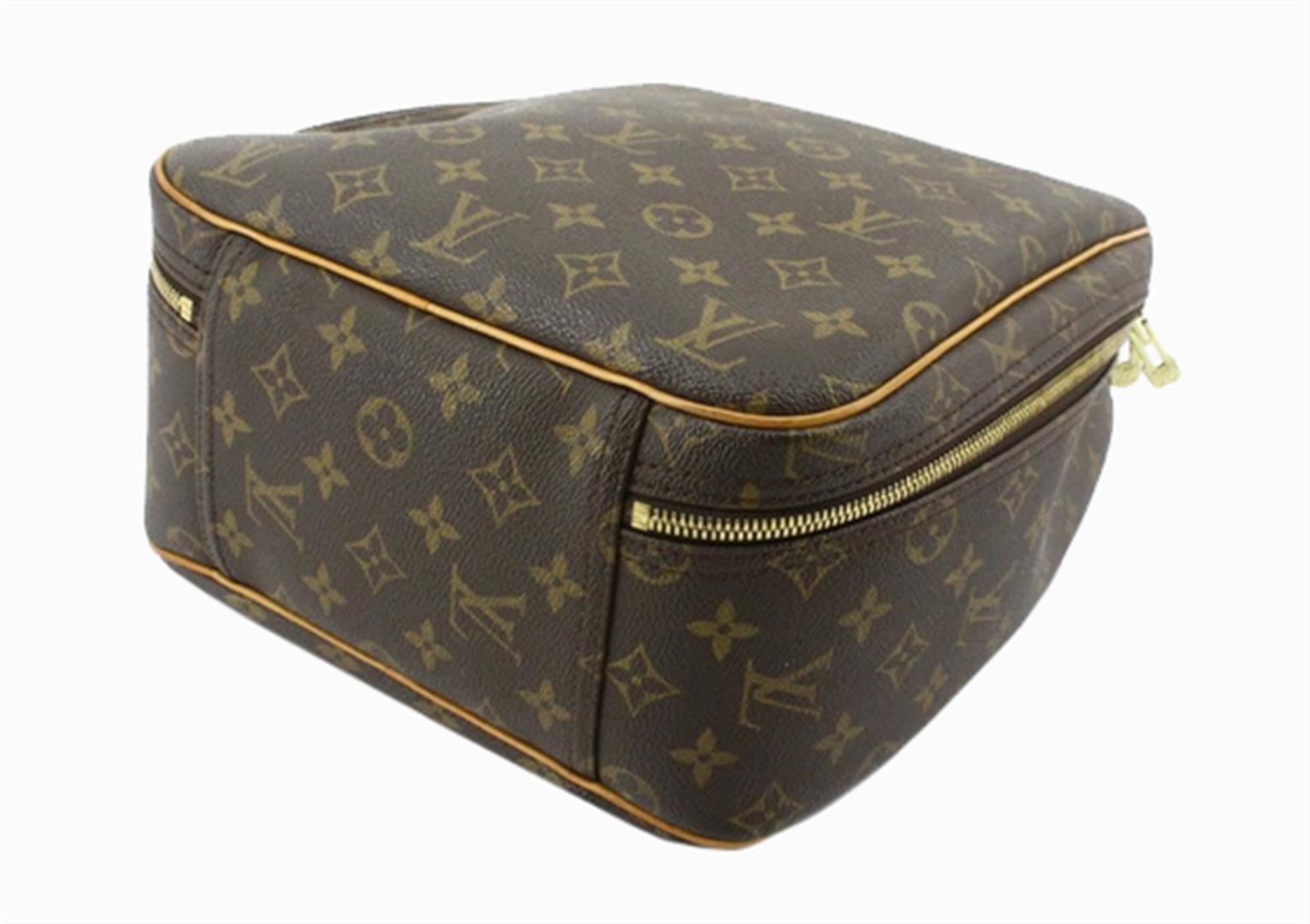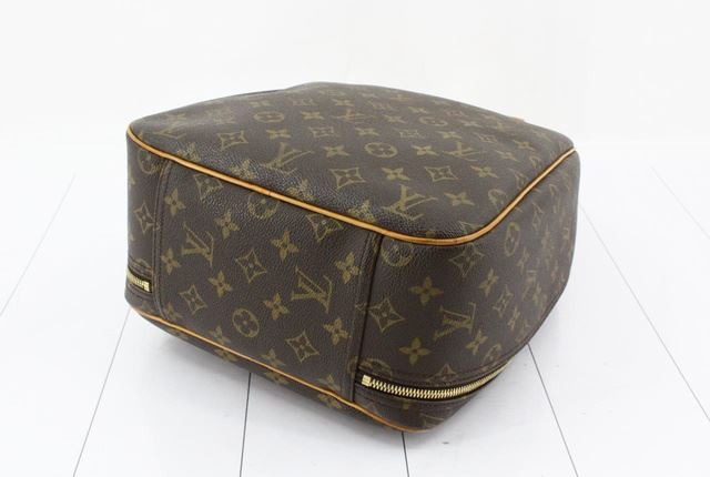 Brown and tan monogram coated canvas Louis Vuitton Excursion bag with gold-tone hardware, tan vachetta leather trim, dual flat top handles, beige canvas lining, single interior wall pocket and two-way zip-around closure. 9.5"x4.75"x12.5"xBag Drop:5"/24