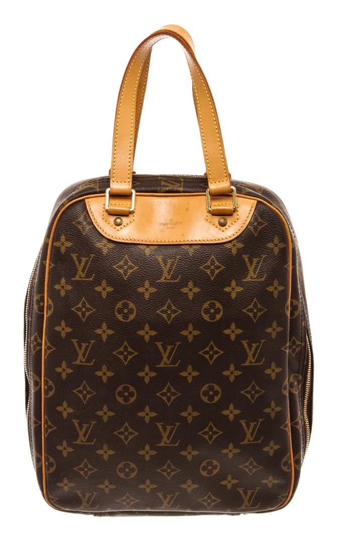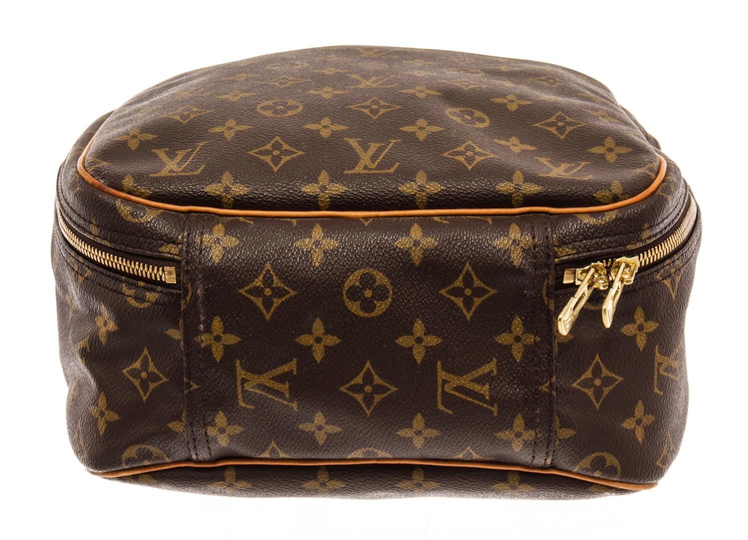 Louis Vuitton Brown Monogram Canvas Leather Excursion Travel Bag. All available information is listed in the description and shown in the photos. Louis Vuitton Brown Monogram Canvas Leather Excursion Travel Bag with the excursion features a monogram canvas body, flat vachetta handles, gold-tone hardware, vachetta trim, canvas lining, a zip around closure at side, and an interior slip pocket. 12.6" L x 7.9" W x 4.3" D, Drop : 5.5" / 32.00 x 20.06 x 10.92 Cm