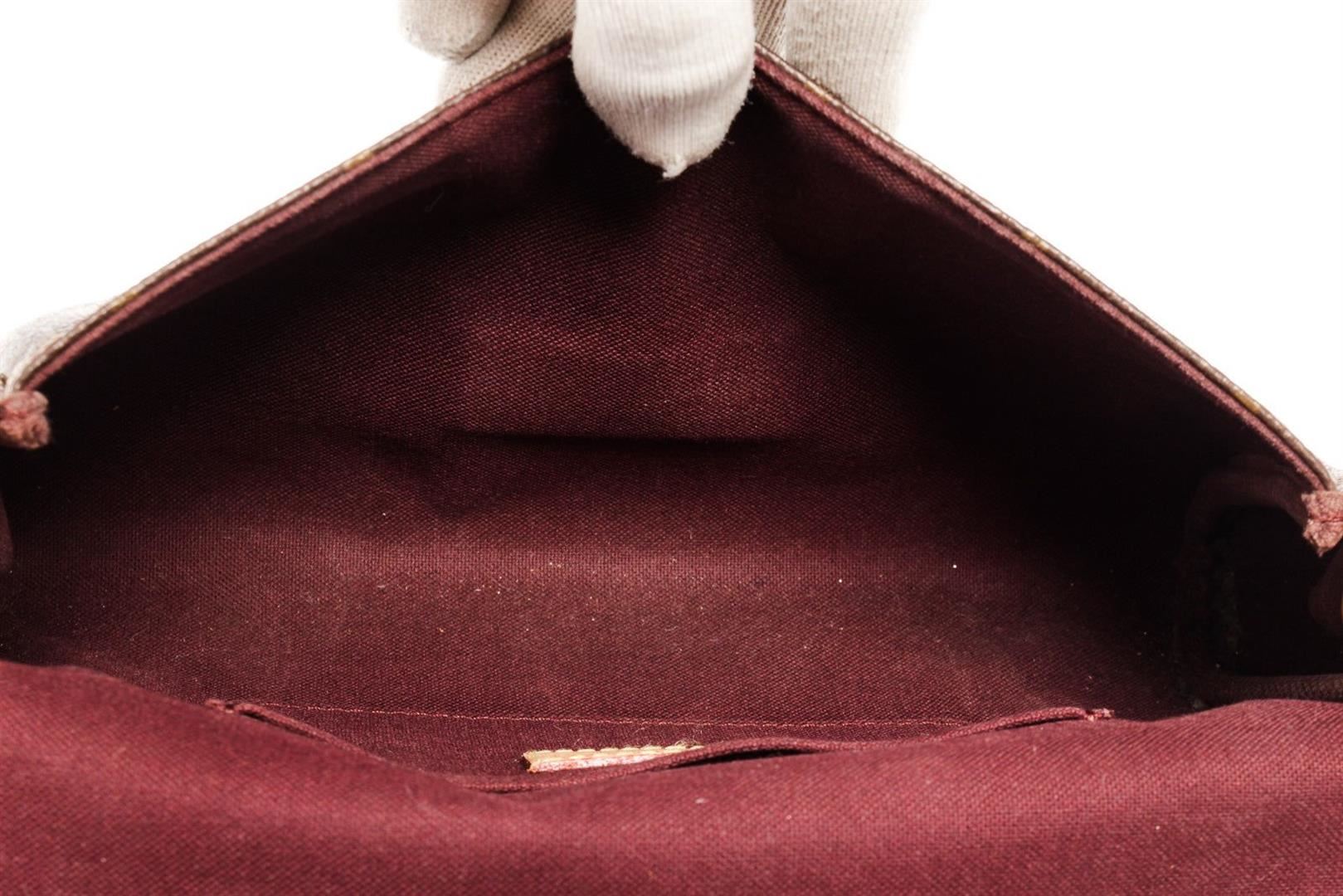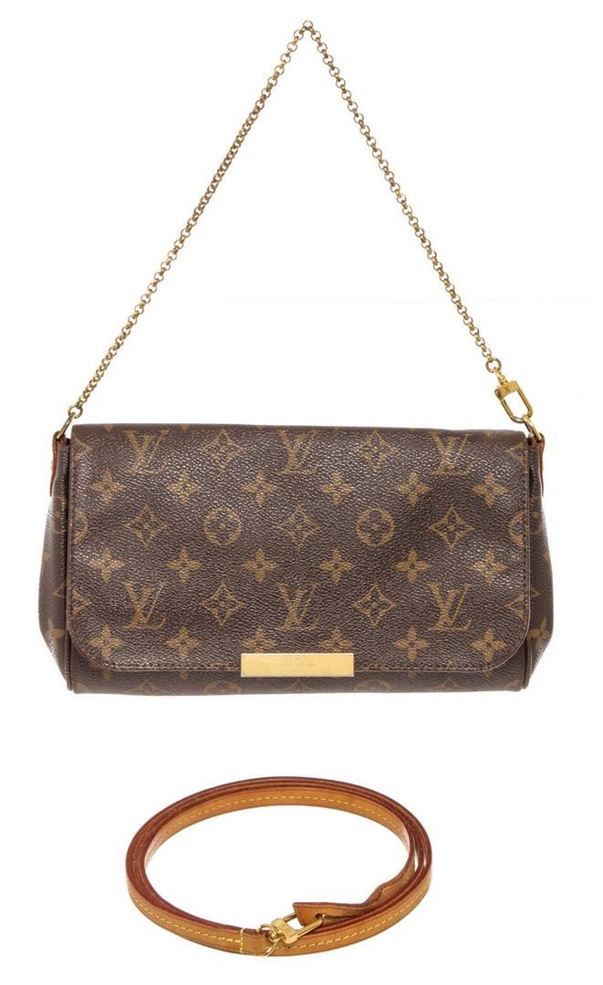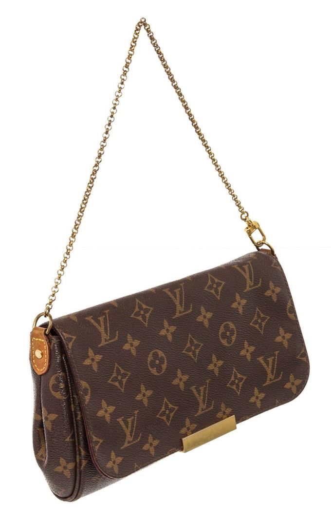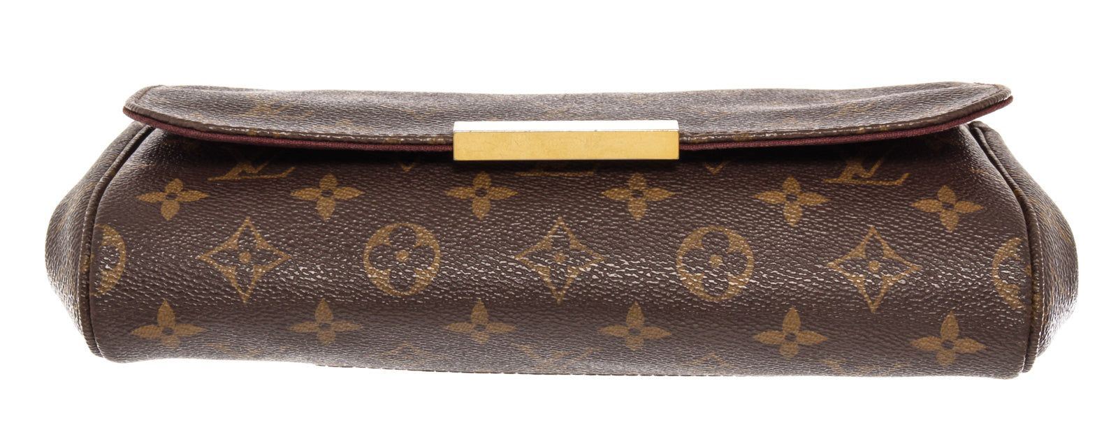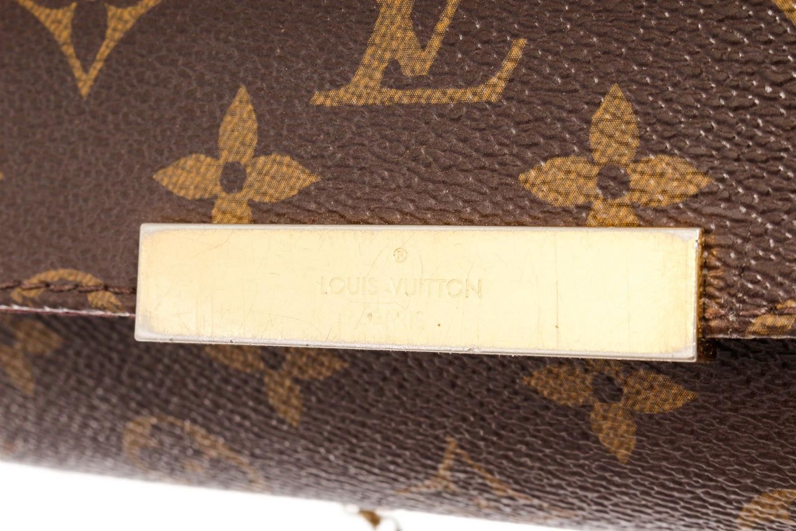 Brown and tan monogram coated canvas Louis Vuitton Favorite MM with brass hardware, detachable flat leather shoulder strap, single top handle with chain-link accent, single flat shoulder strap, burgundy canvas lining, single slit pocket at interior wall a