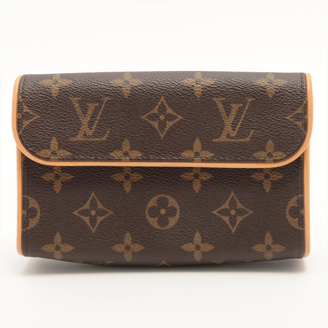 Brown and tan monogram coated canvas Louis Vuitton Pochette Florentine waist bag with gold-tone hardware, tan vachetta leather trim, optional waist strap with snap closure, beige Alcantara lining and flap with magnetic snap closure at front. 6.5"x1.5"x
