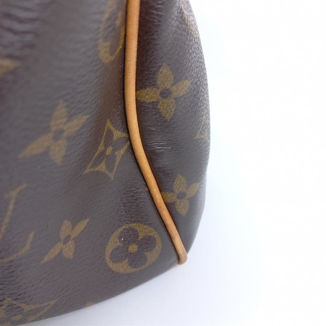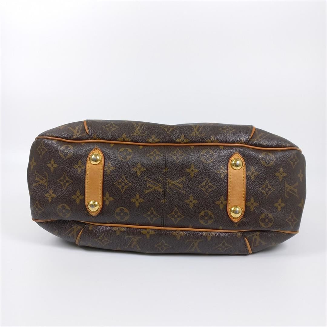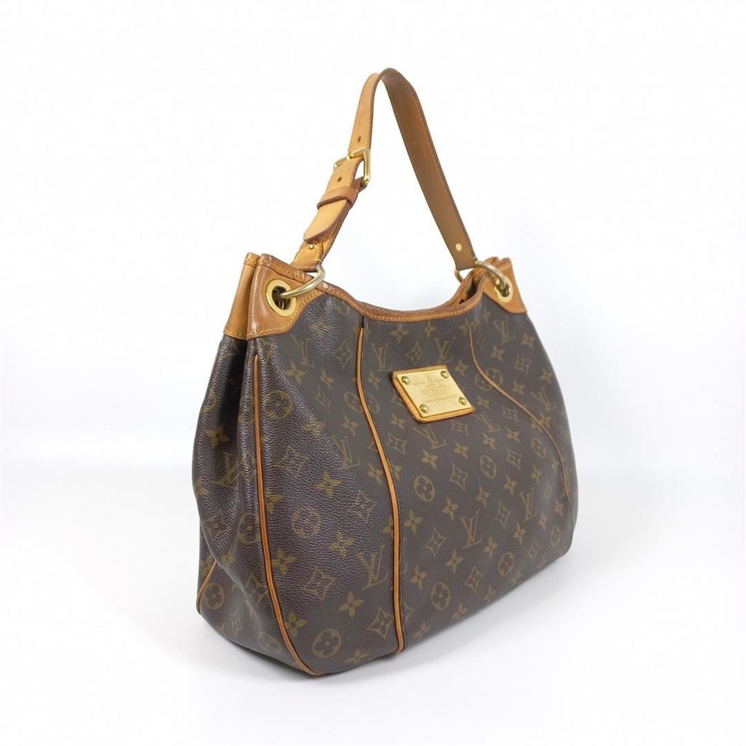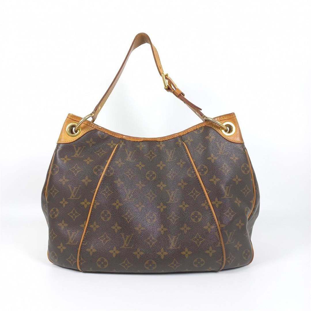 Brown and tan monogram coated canvas Louis Vuitton Galliera PM with gold-tone hardware, tan vachetta leather trim, single flat shoulder strap, logo placard at front face, beige Alcantara lining, single pocket at interior wall with flap and snap closure an