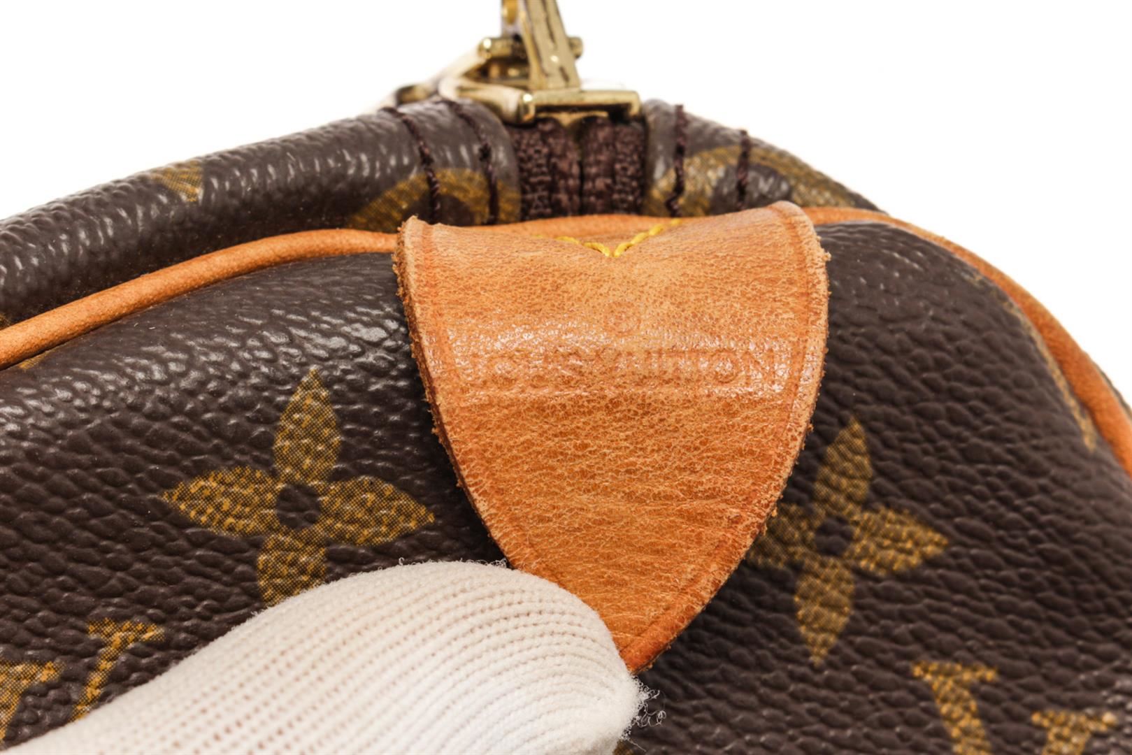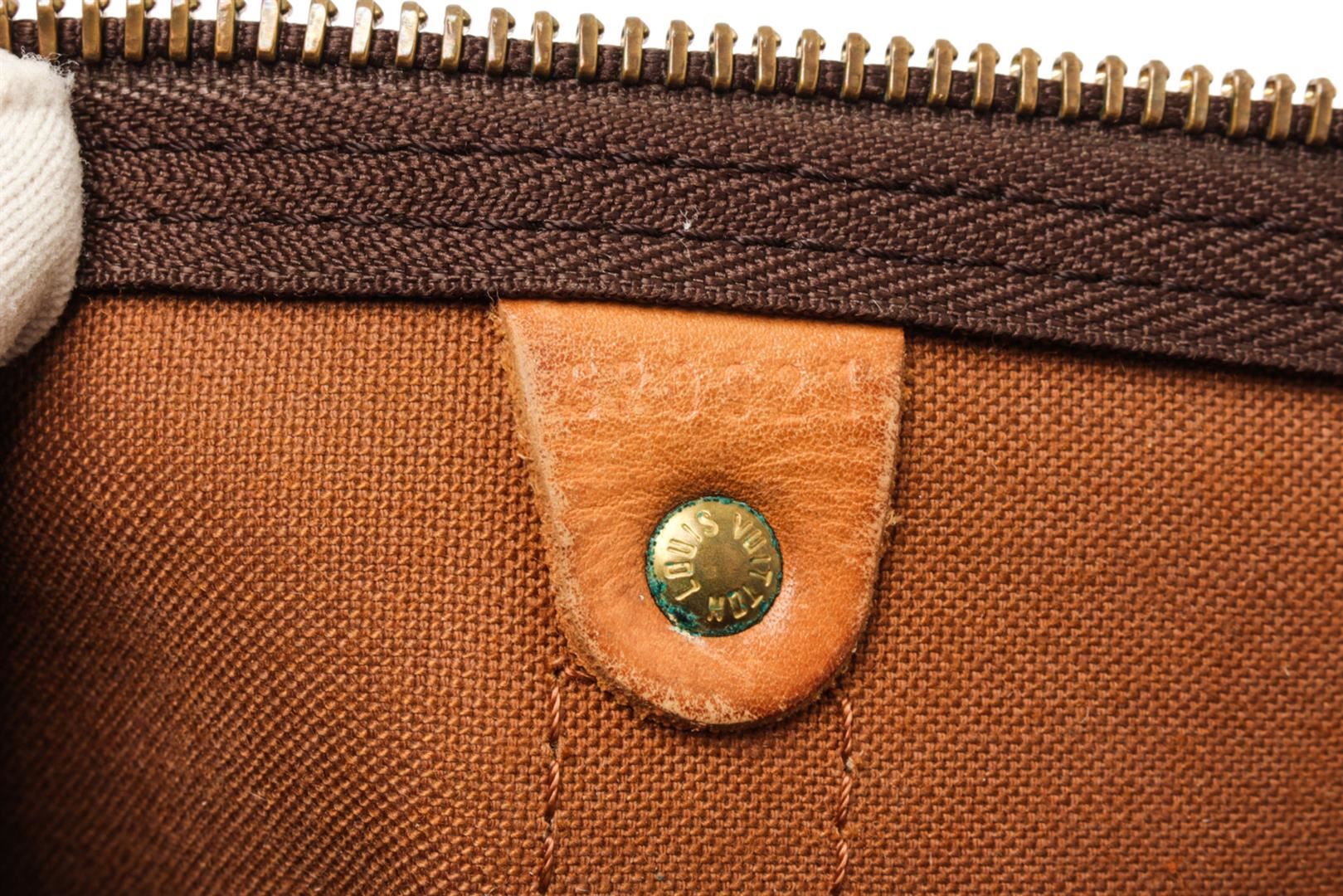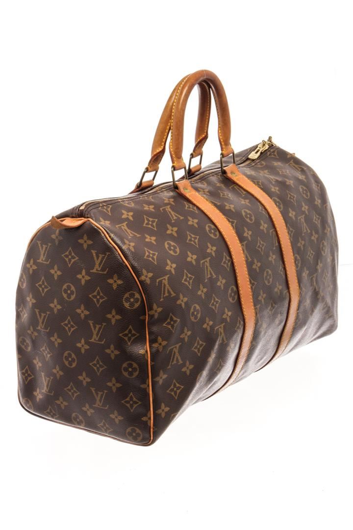 Louis Vuitton Brown Monogram Canvas Leather Keepall 45 Travel Bag. All available information is listed in the description and shown in the photos. Vintage Louis Vuitton brown monogram canvas Keepall 45 travel bag with gold-toned hardware, rolled leather handles, and top zipper closure. Height: 10.25" Width: 18" Depth: 7.75", Handle Drop: 4.5" / 26.03 x 45.72 x 19.68 Cm