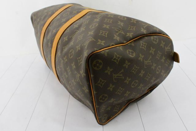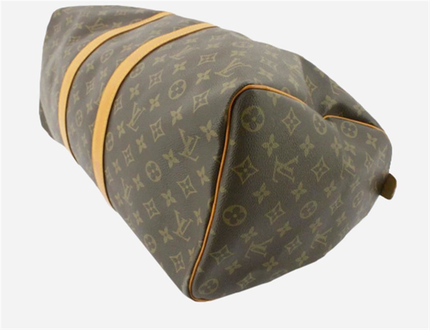 Brown and tan monogram coated canvas Louis Vuitton Keepall 45 with gold-tone hardware, tan vachetta leather trim, dual rolled top handles, brown canvas lining and zip closure at top. 18.5"x8"x10"xBag Drop:4.25"/46.9cmx20.3cmx25.4cmxBag Drop:10.7cm