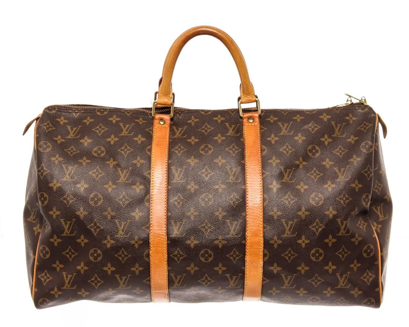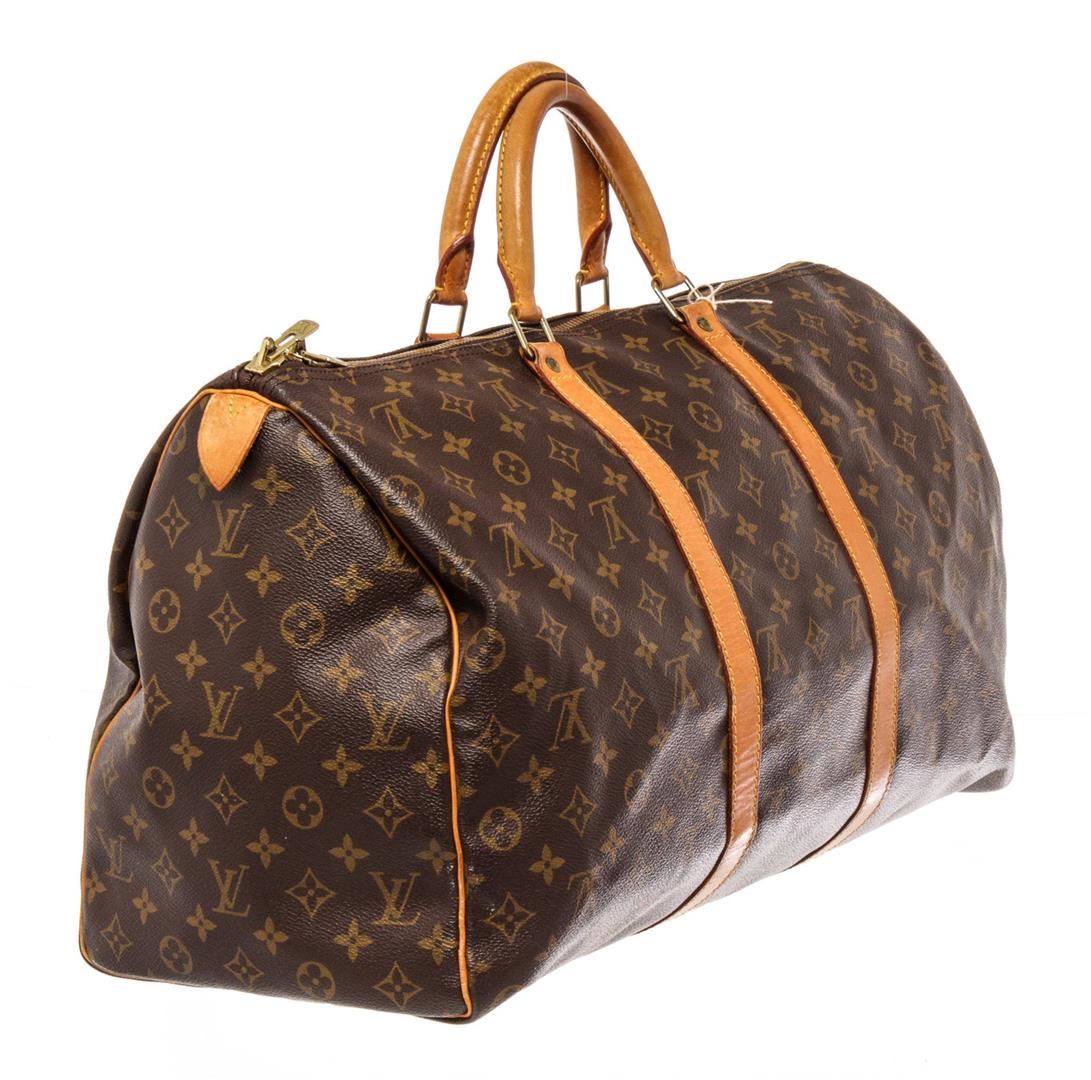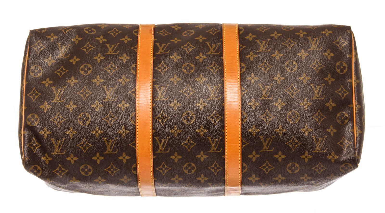 Brown and tan monogram coated canvas Louis Vuitton Keepall 50 with vachetta leather trim, brass hardware, two rolled top handles, canvas interior lining and two-way zip closure at top.