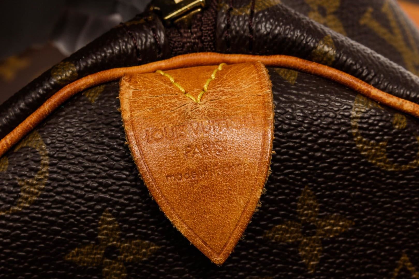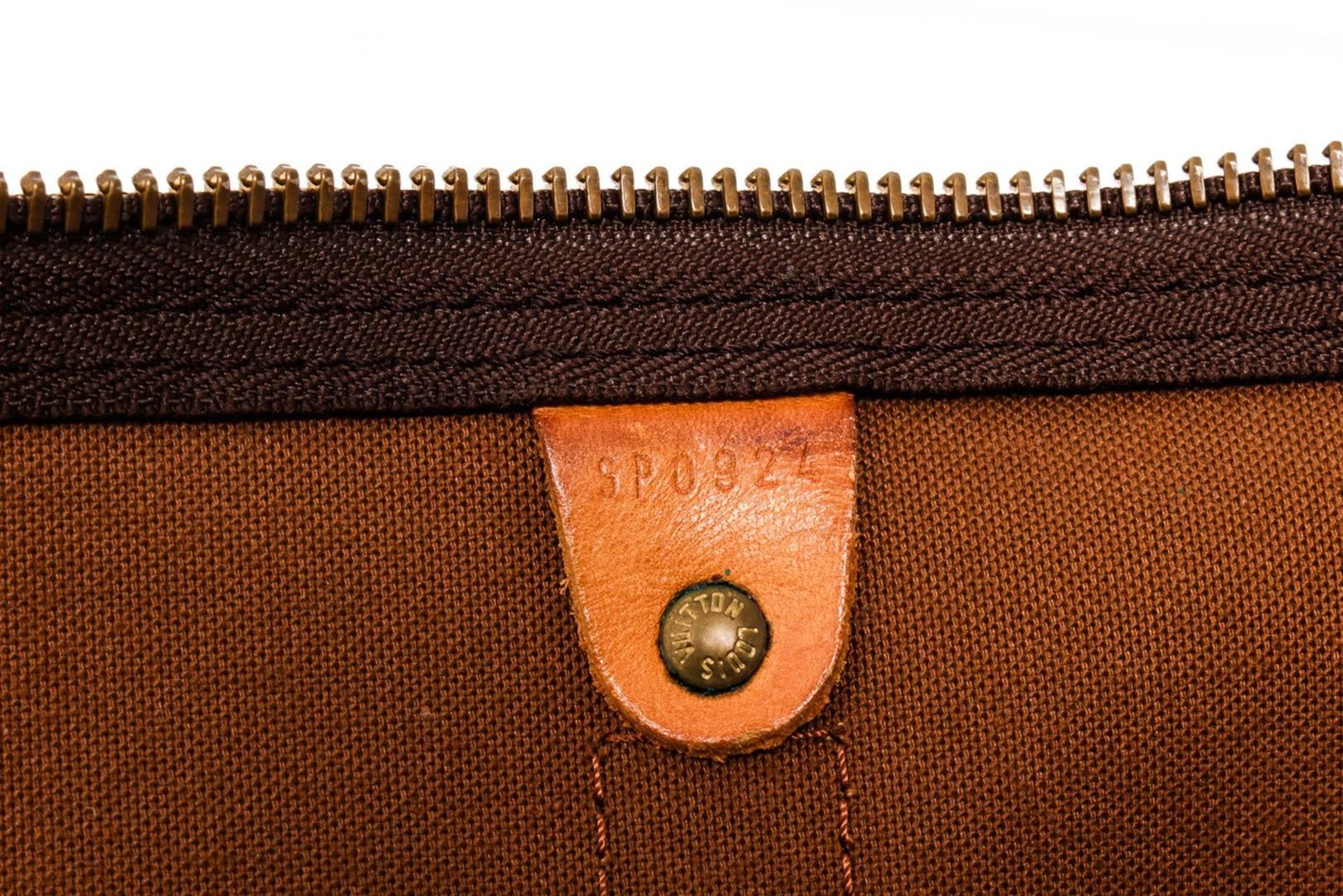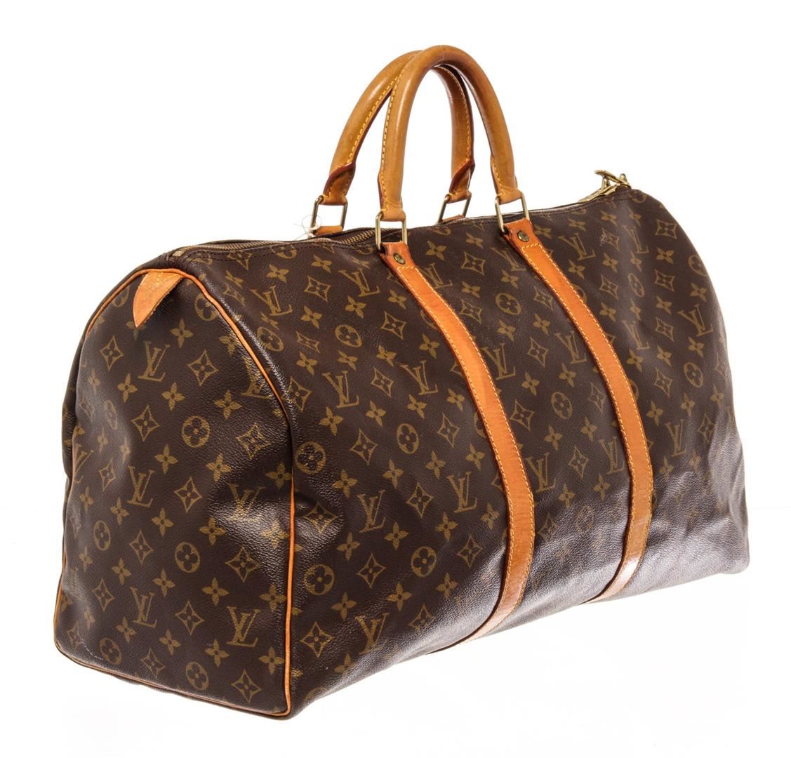 Brown and tan monogram coated canvas Louis Vuitton Keepall 50 with vachetta leather trim, brass hardware, two rolled top handles, canvas interior lining and two-way zip closure at top.