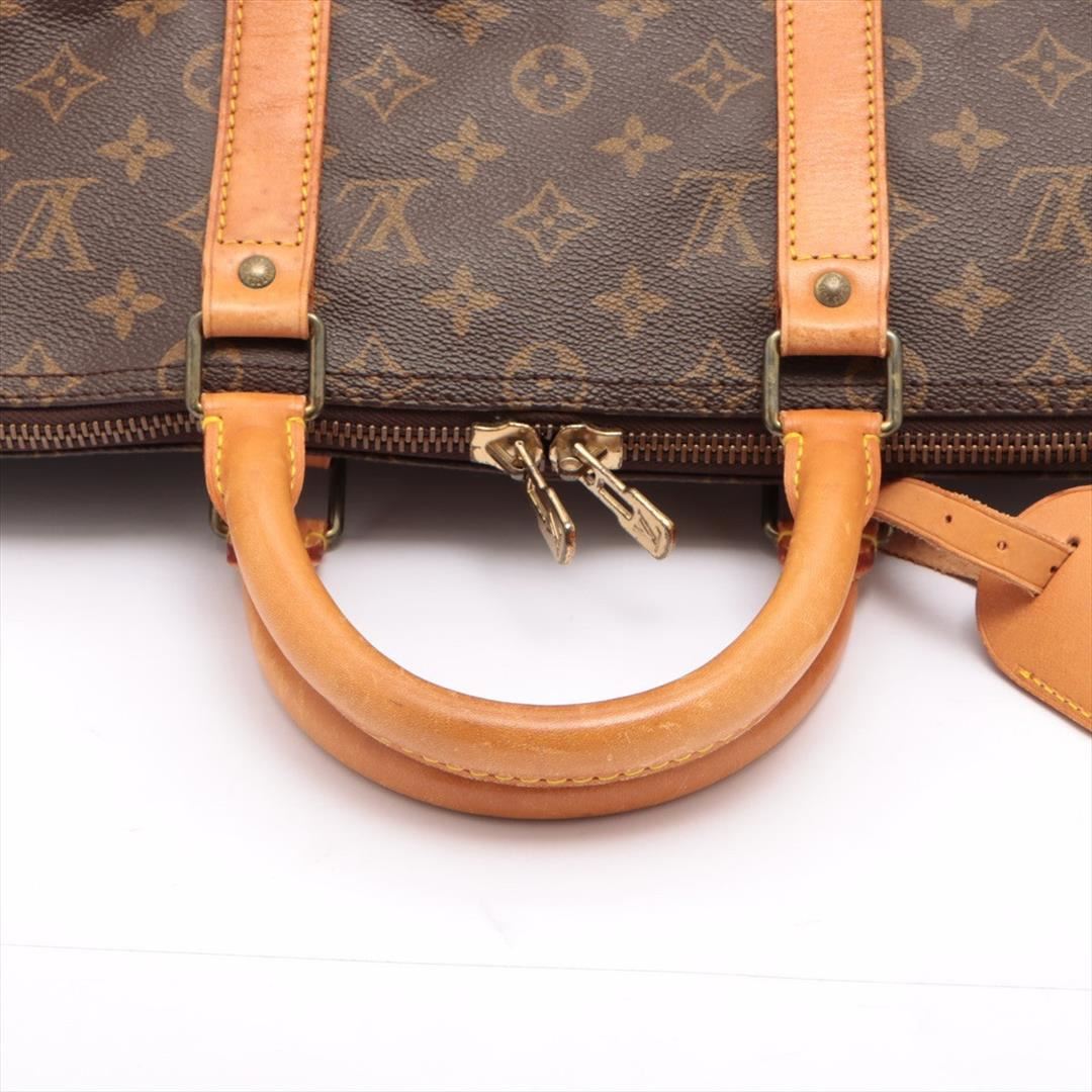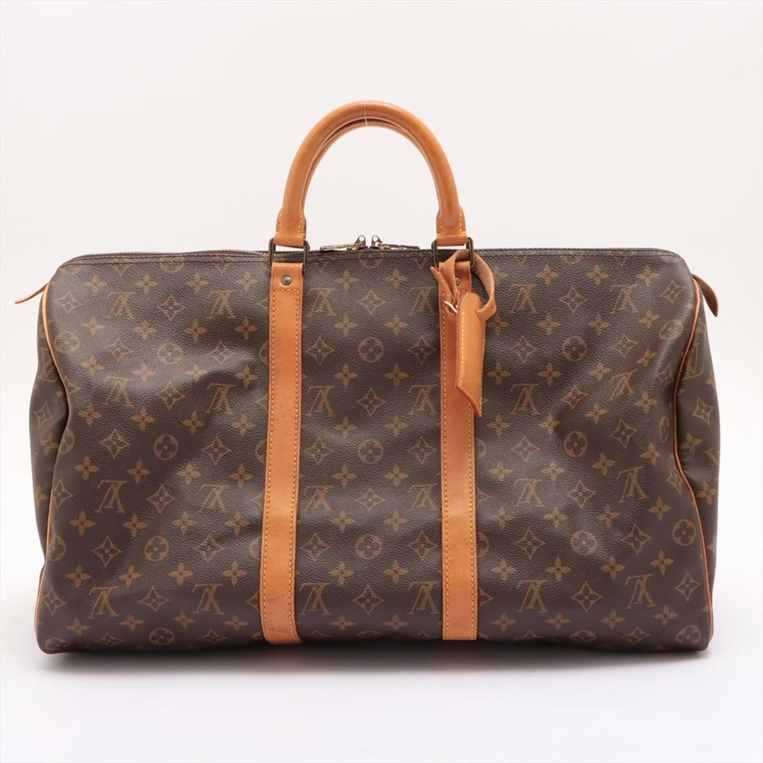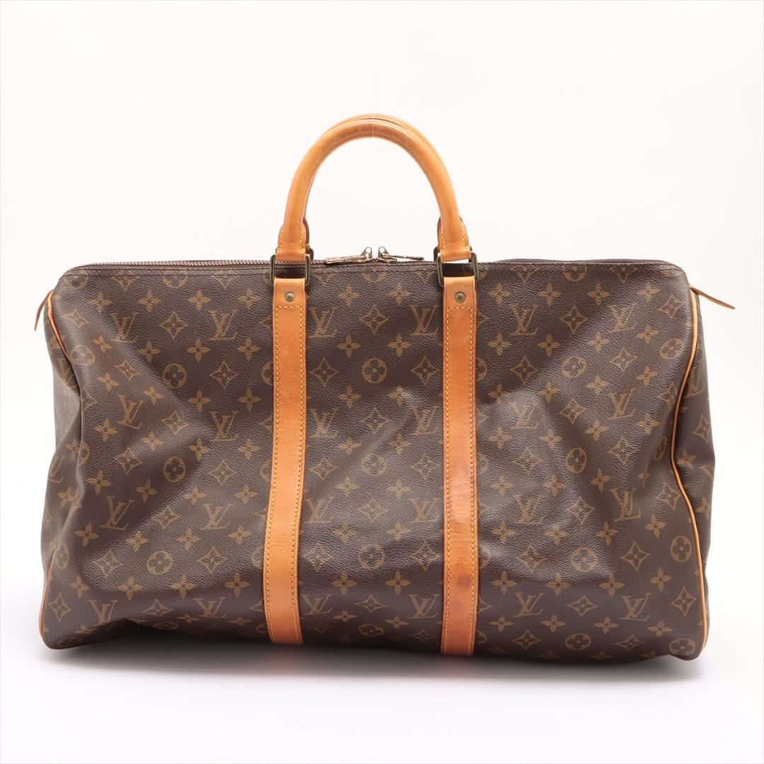 Brown and tan monogram coated canvas Louis Vuitton Keepall 50 with tan vachetta leather trim, gold-tone hardware, two rolled top handles, brown canvas interior lining and two-way zip closure at top. Height: 13" Width: 21" Depth: 9" Handle Drop: 4"