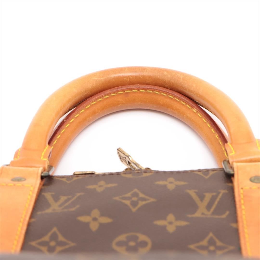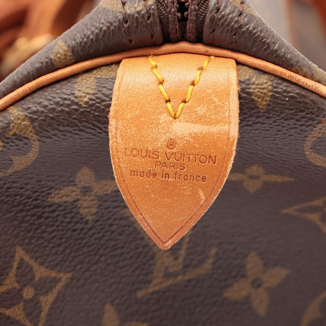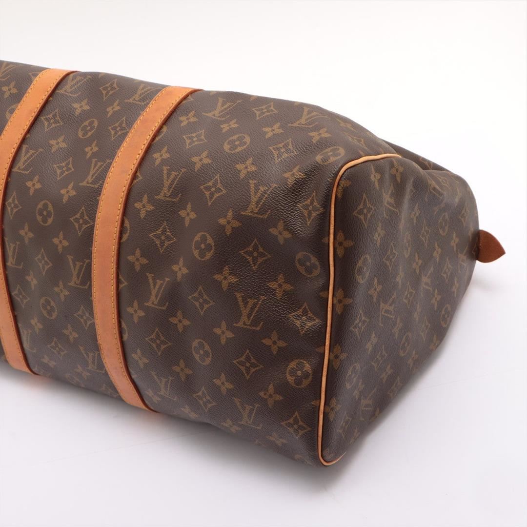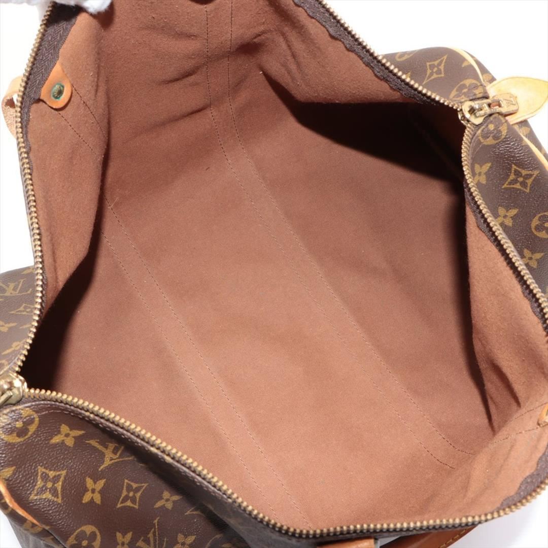 Brown and tan monogram coated canvas Louis Vuitton Keepall 50 with tan vachetta leather trim, gold-tone hardware, two rolled top handles, brown canvas interior lining and two-way zip closure at top. Height: 13" Width: 21" Depth: 9" Handle Drop: 4"