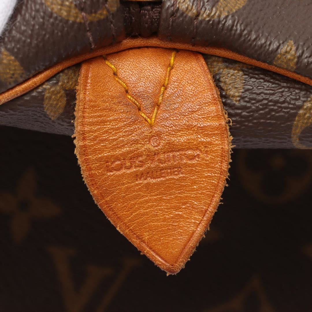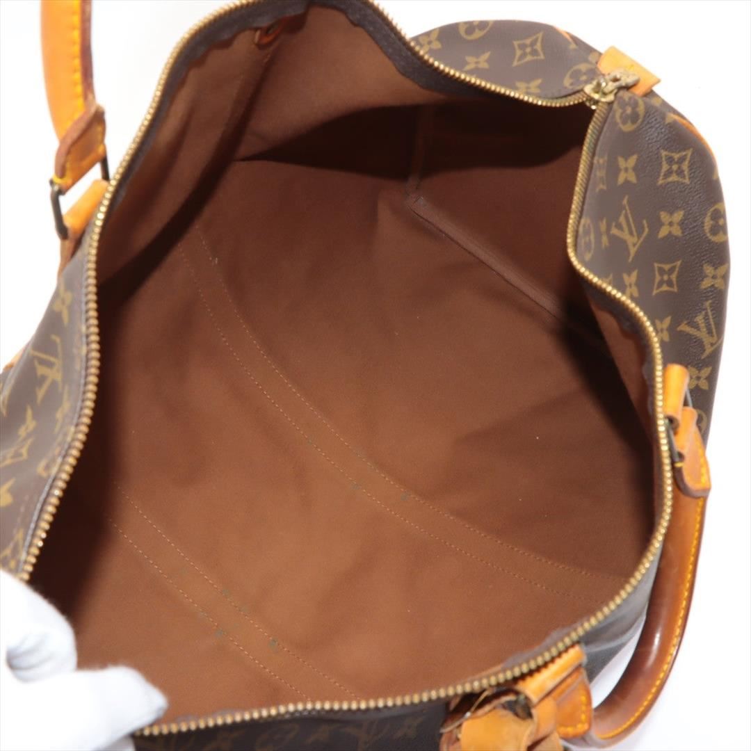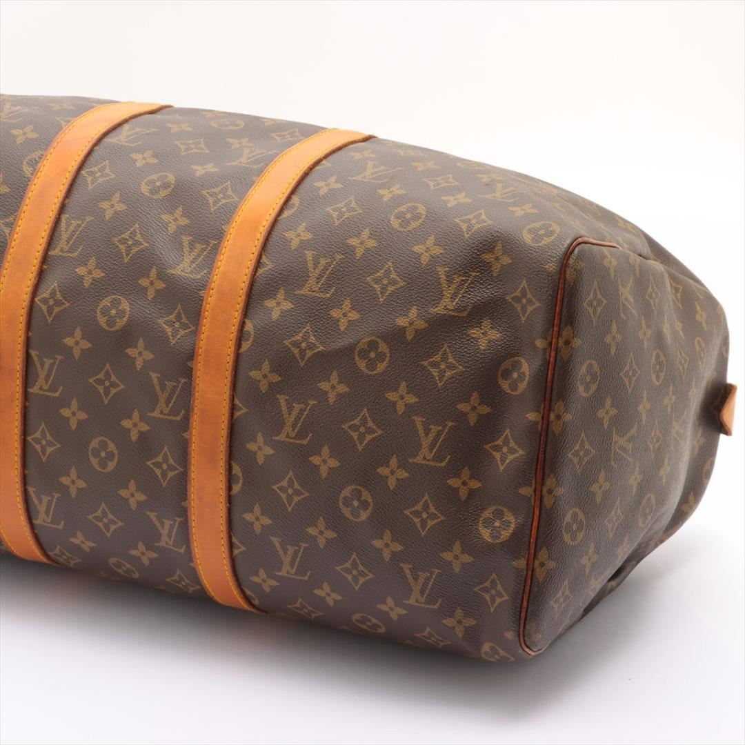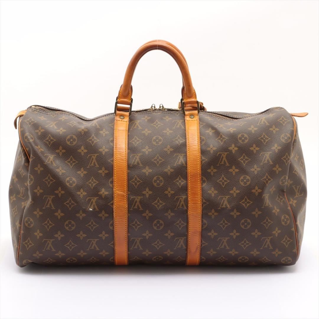 Brown and tan monogram coated canvas Louis Vuitton Keepall 50 with tan vachetta leather trim, gold-tone hardware, two rolled top handles, brown canvas interior lining and two-way zip closure at top. Height: 13" Width: 21" Depth: 9" Handle Drop: 4"