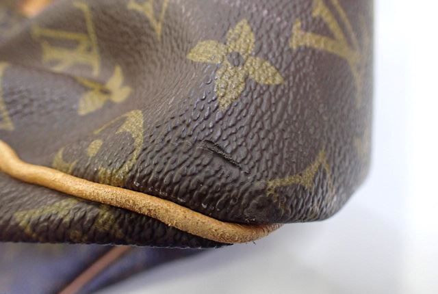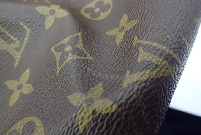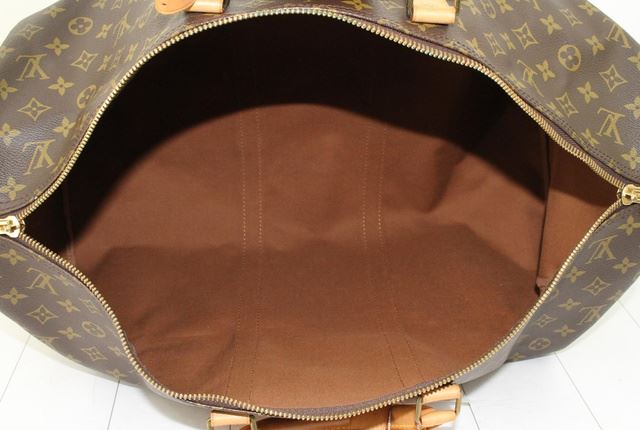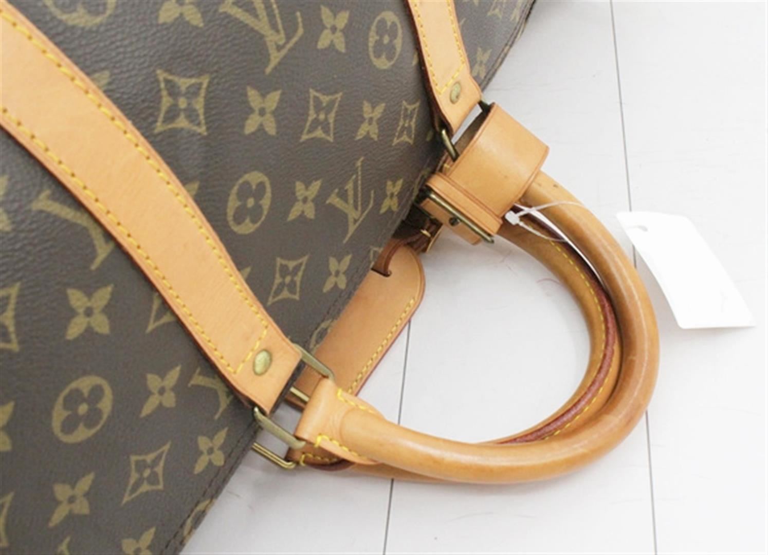 Brown and tan monogram coated canvas Louis Vuitton Keepall 55 with gold-tone hardware, tan vachetta leather trim featuring yellow contrast stitching, dual rolled top handles, brown canvas lining and zip closure at top. 22"x10"x12"xBag Drop:5"/55.8cmx25