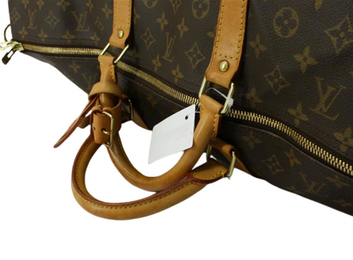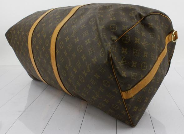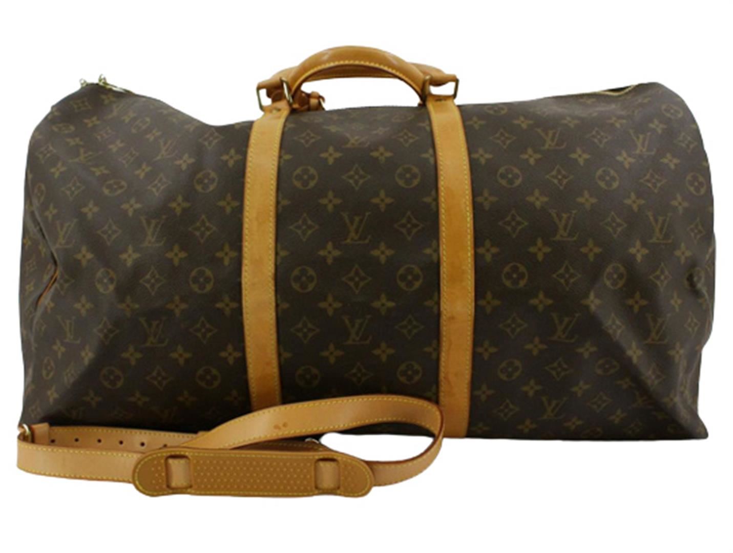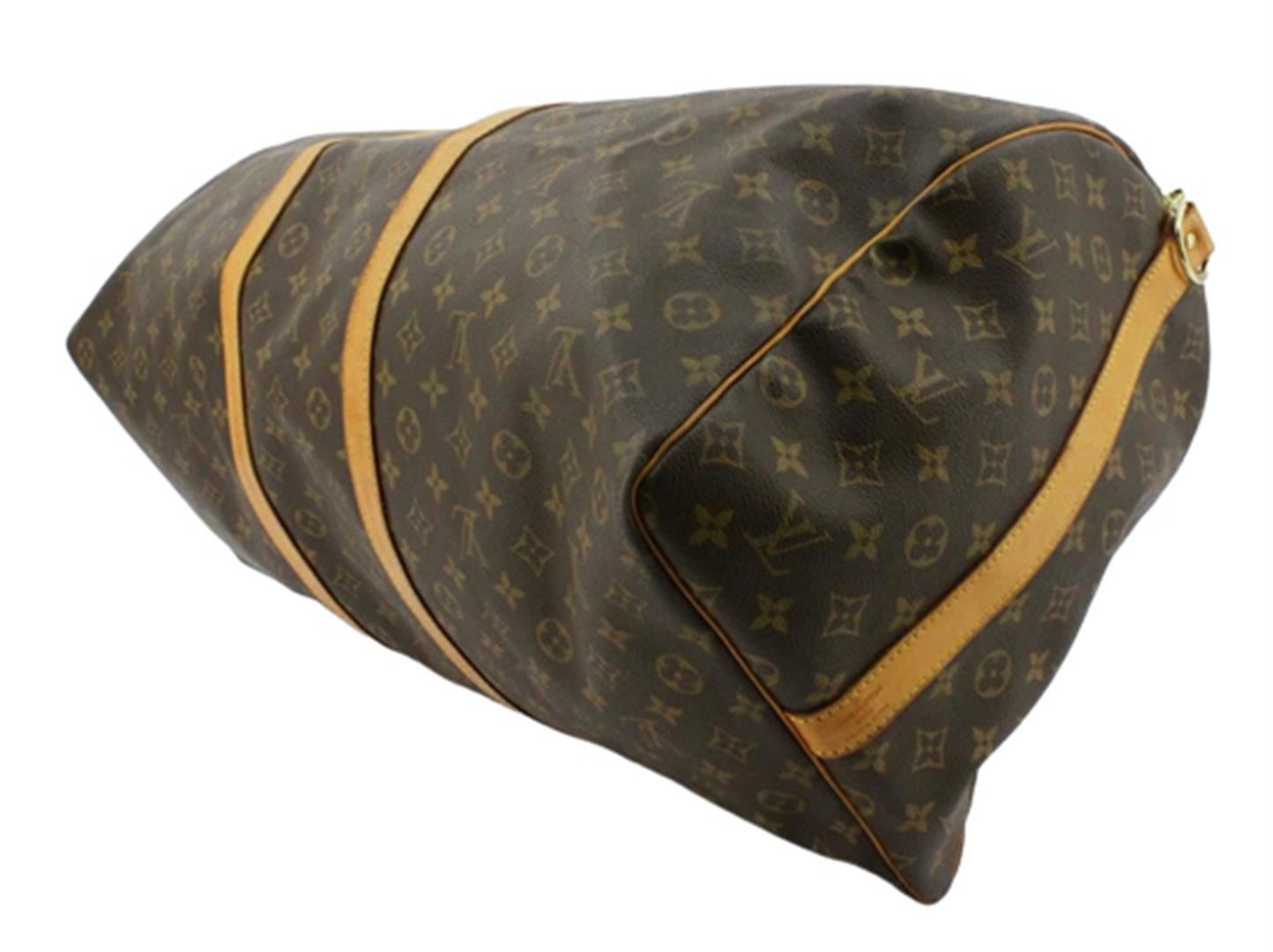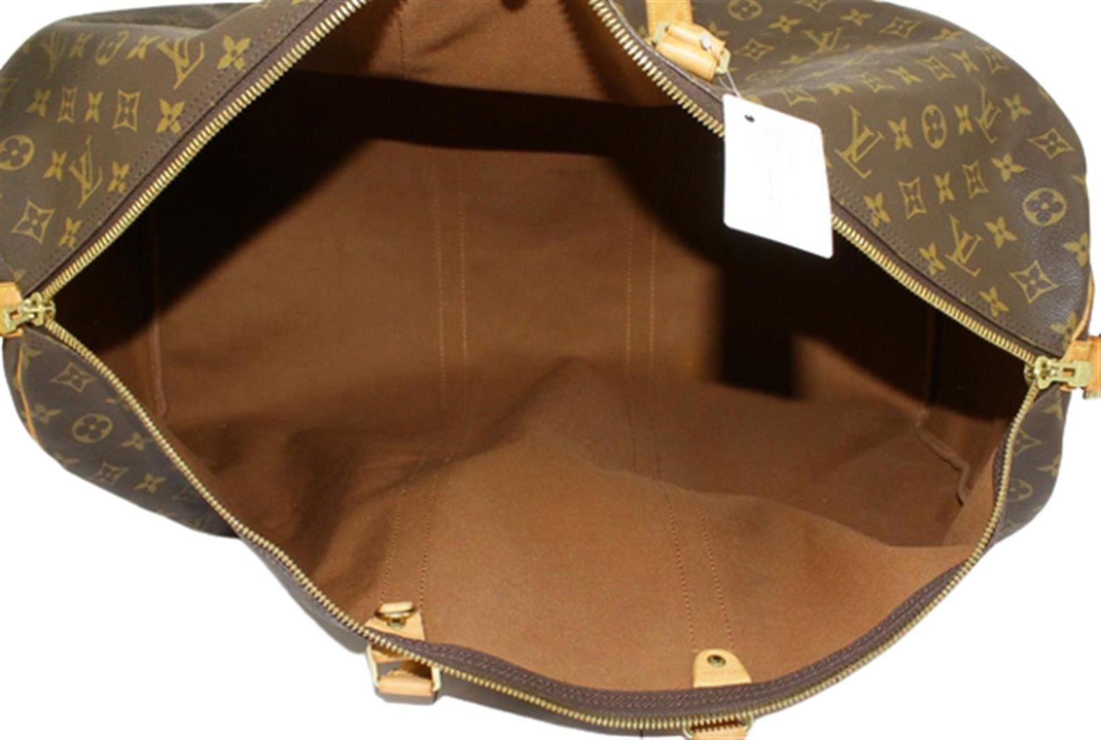Brown and tan monogram coated canvas Louis Vuitton Keepall 60 Bandouliere with gold-tone hardware, tan vachetta leather trim, dual rolled handles, brown canvas lining and zip closure at top. Detachable shoulder strap. 23.5"x10"x13"xStrap Drop:20"/59.6c