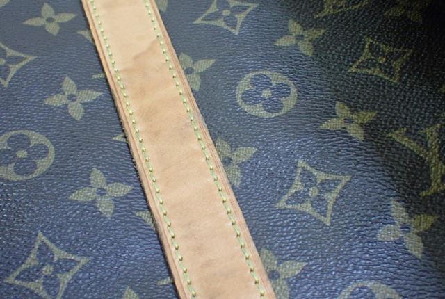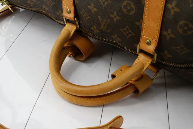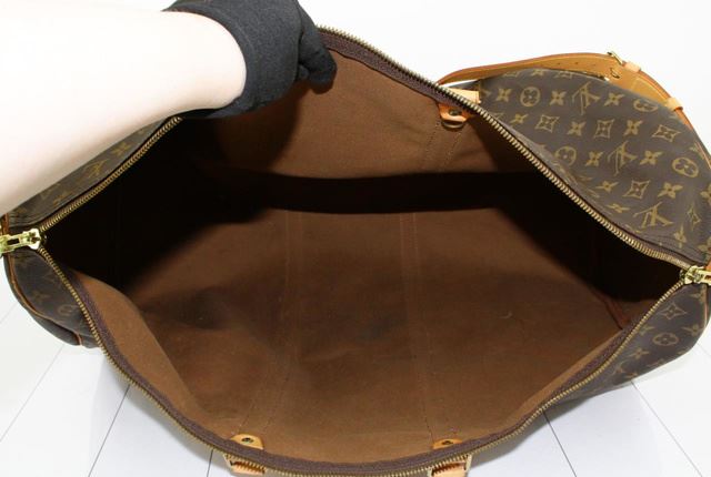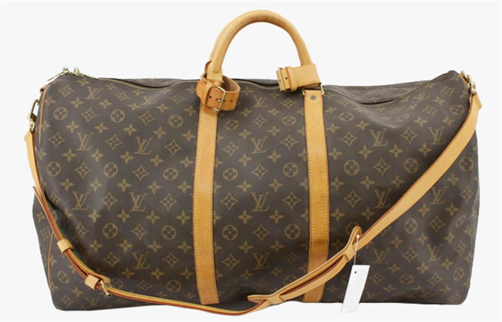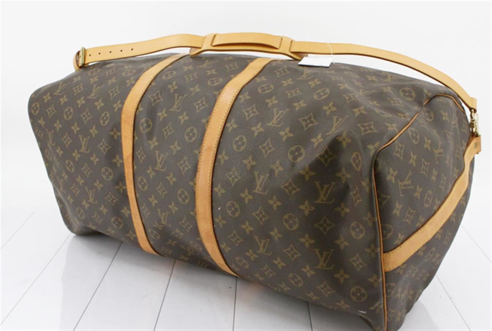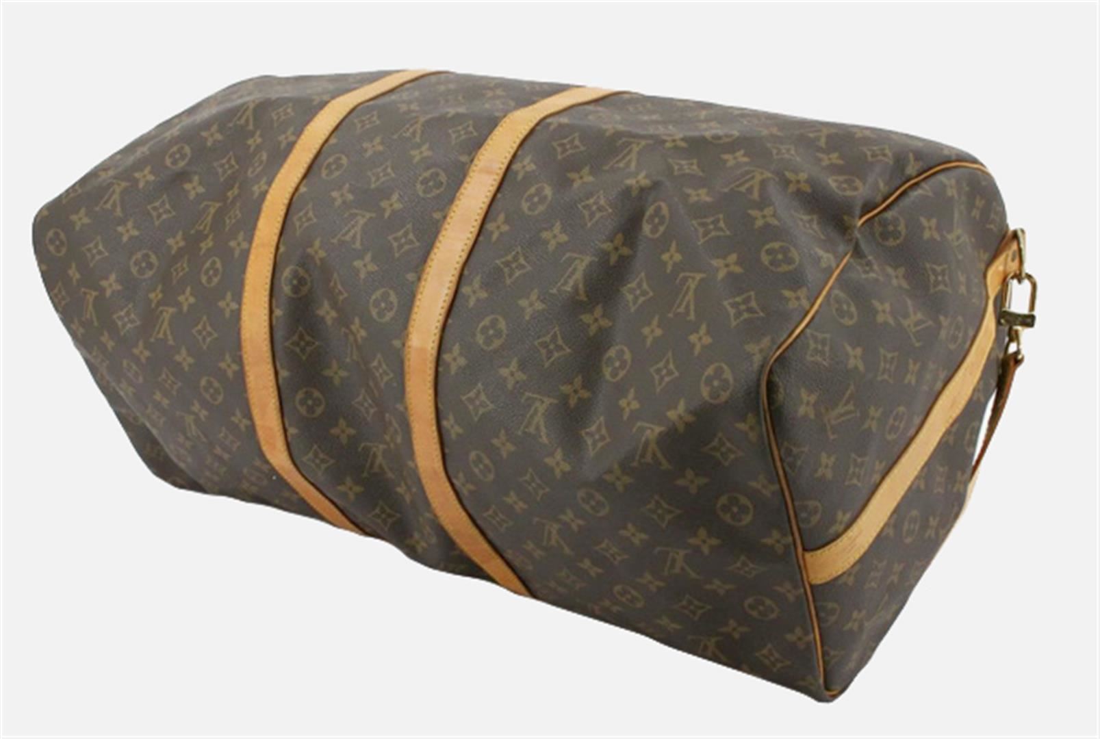 Brown and tan monogram coated canvas Louis Vuitton Keepall 60 Bandouliere with gold-tone hardware, tan vachetta leather trim, dual rolled handles, brown canvas lining and zip closure at top. 23.5"x10"x13"xStrap Drop:20"/59.6cmx25.4cmx33cmxStrap Drop:50