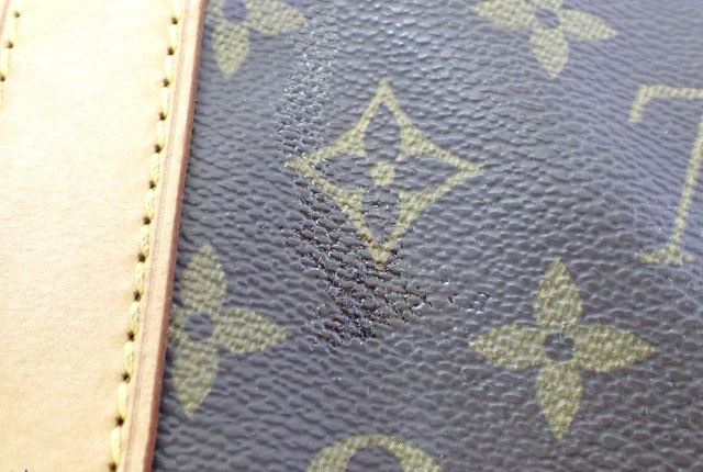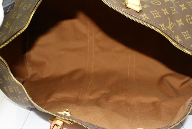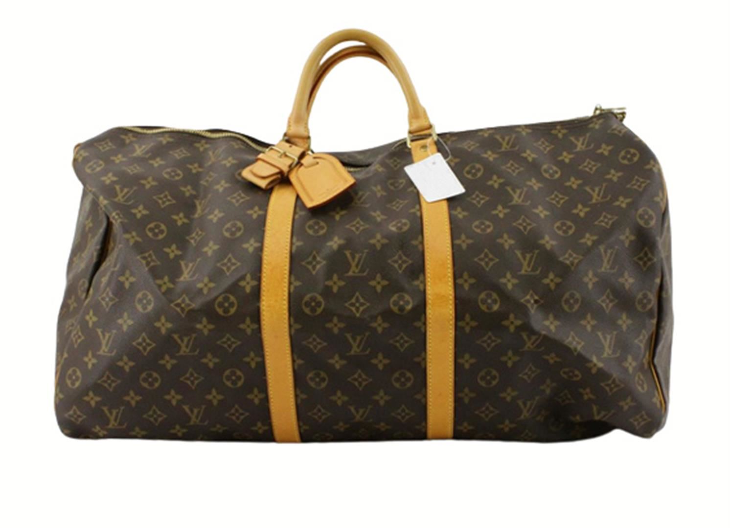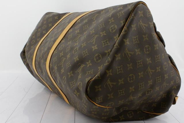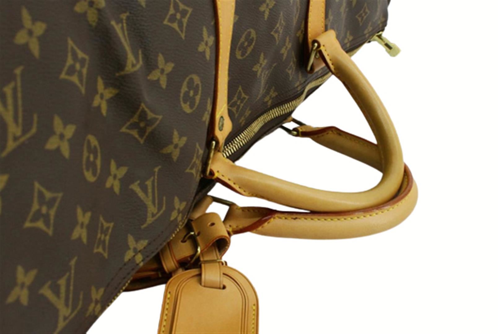 Brown and tan monogram coated canvas Louis Vuitton Keepall 60 with gold-tone hardware, tan vachetta leather trim, dual rolled handles, brown canvas lining and zip closure at top. 23.5"x10"x13"xBag Drop:3.5"/59.6cmx25.4cmx33cmxBag Drop:8.8cm