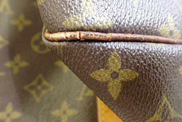 Brown and tan monogram coated canvas Louis Vuitton Keepall Bandoulière th gold-tone hardware, tan vachetta leather trim, dual rolled top handles, detachable adjustable shoulder strap, brown canvas lining and two-way zip closure at top. 8.5"x9"x10"xBa
