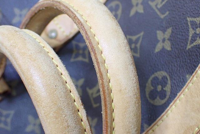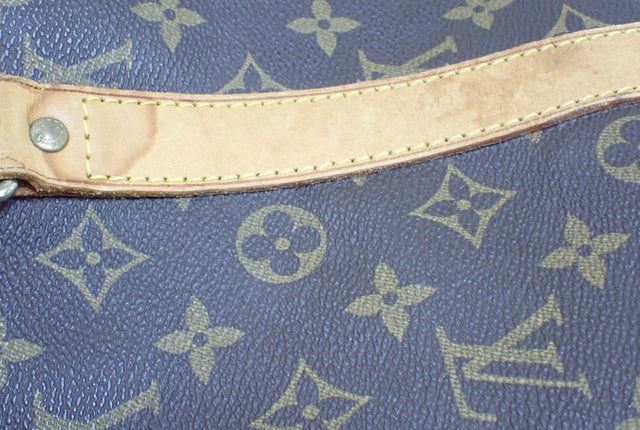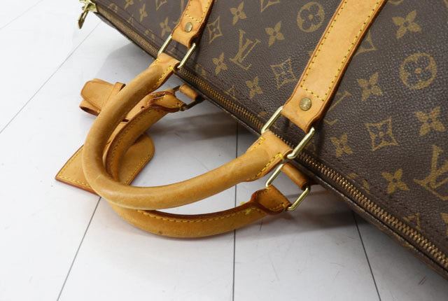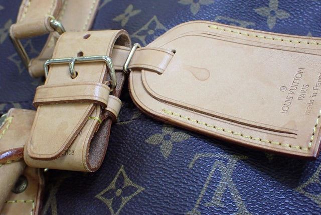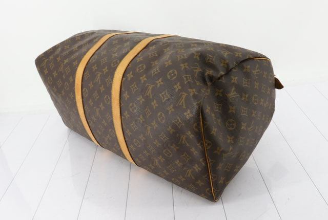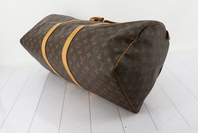 Brown and tan monogram coated canvas Louis Vuitton Keepall th gold-tone hardware, tan vachetta leather trim featuring yellow contrast stitching, dual rolled top handles, luggage tag, brown canvas lining and zip closure at top. 22"x10"x12"xBag Dro