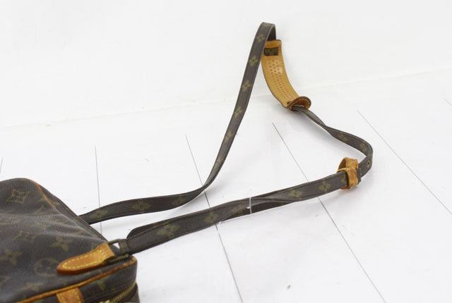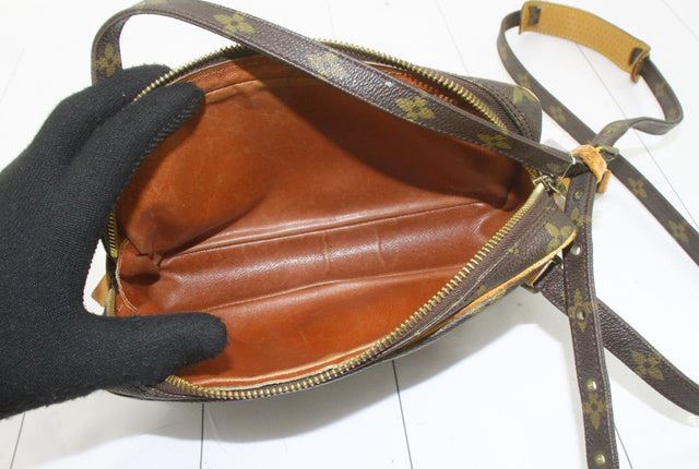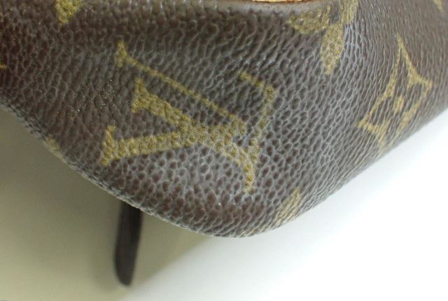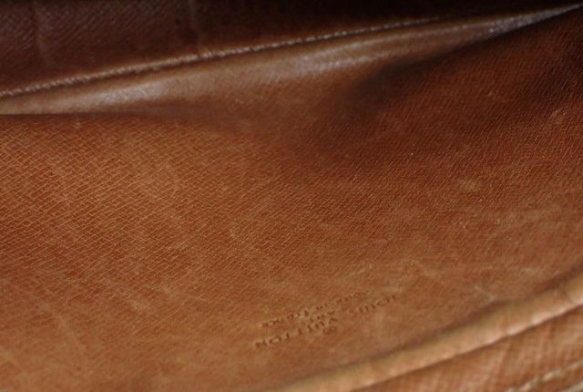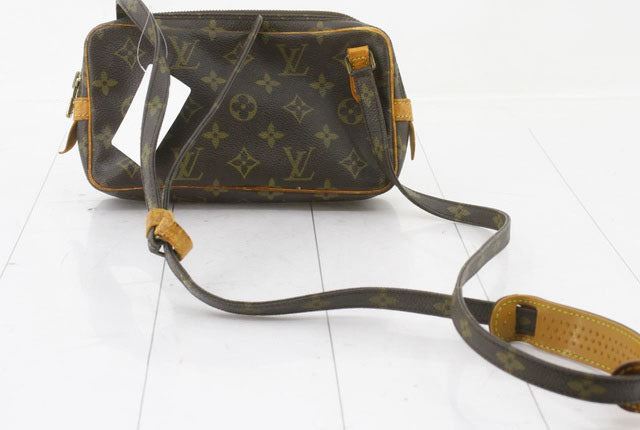 Brown and tan monogram coated canvas Louis Vuitton Pochette Marly Bandoulière with gold-tone hardware, single flat shoulder strap, brown Taiga leather interior and zip closure at top. 6 8.5"x1.5"x5"xBag Drop:1.5cmx3.8cmx12.7cmxm